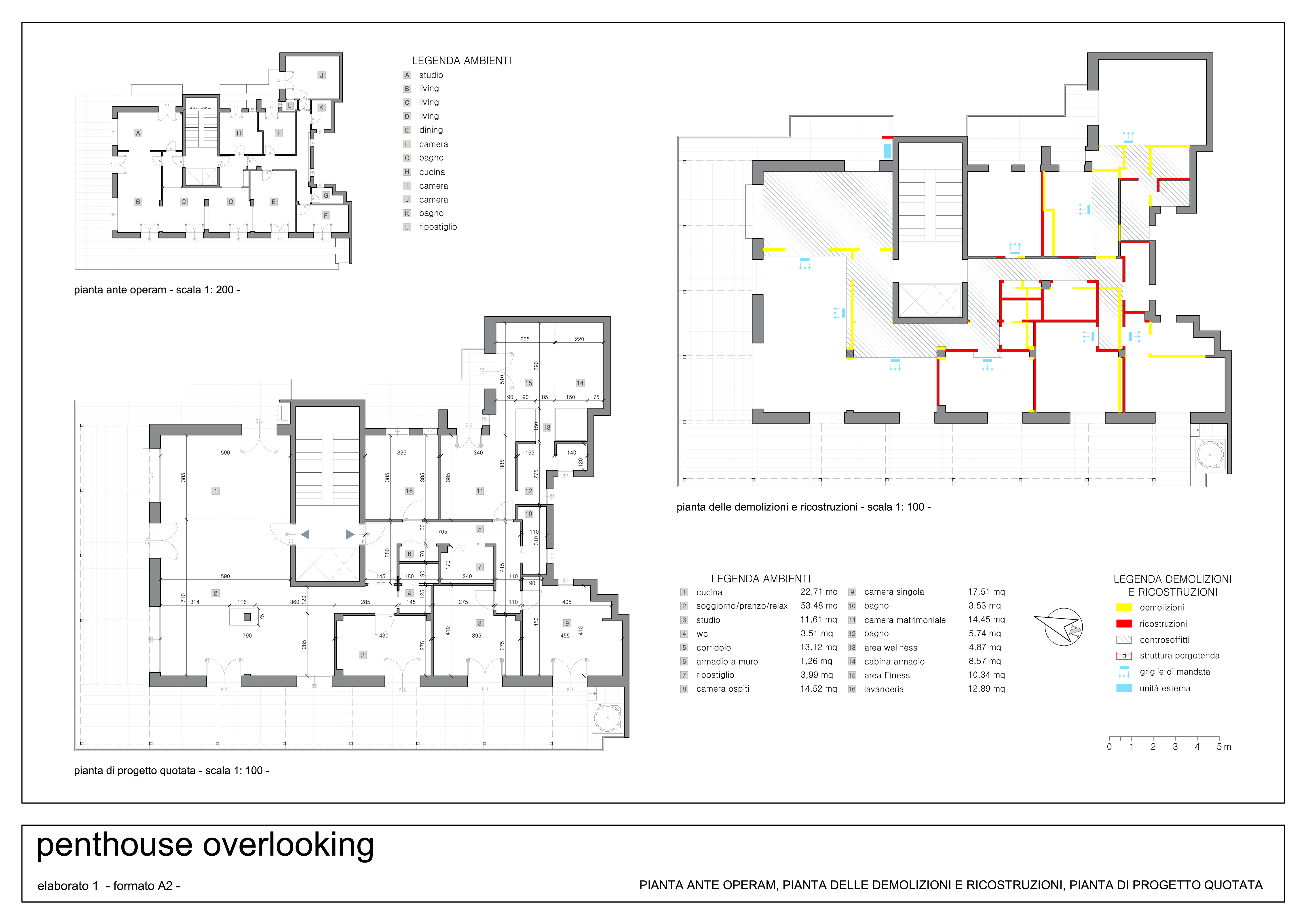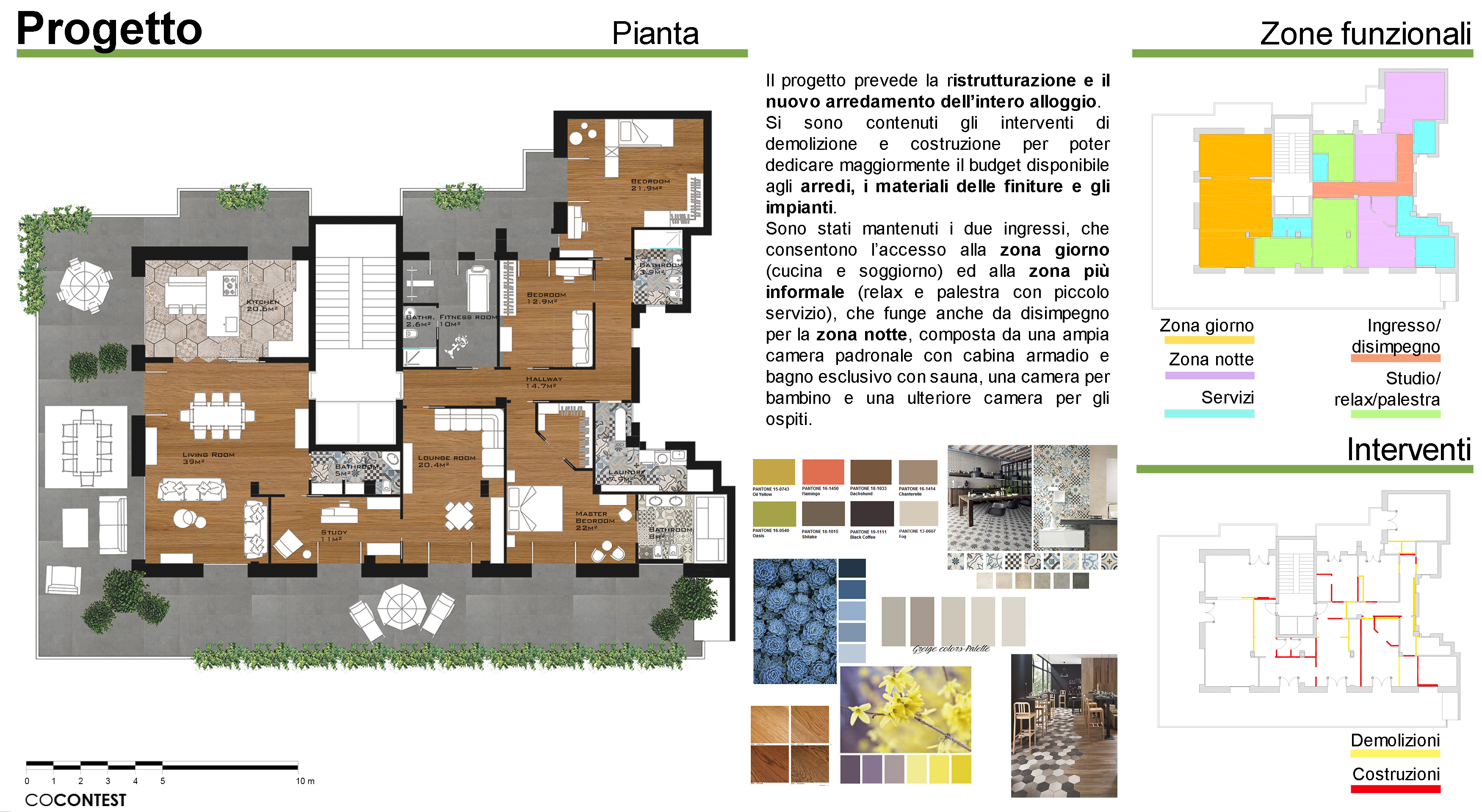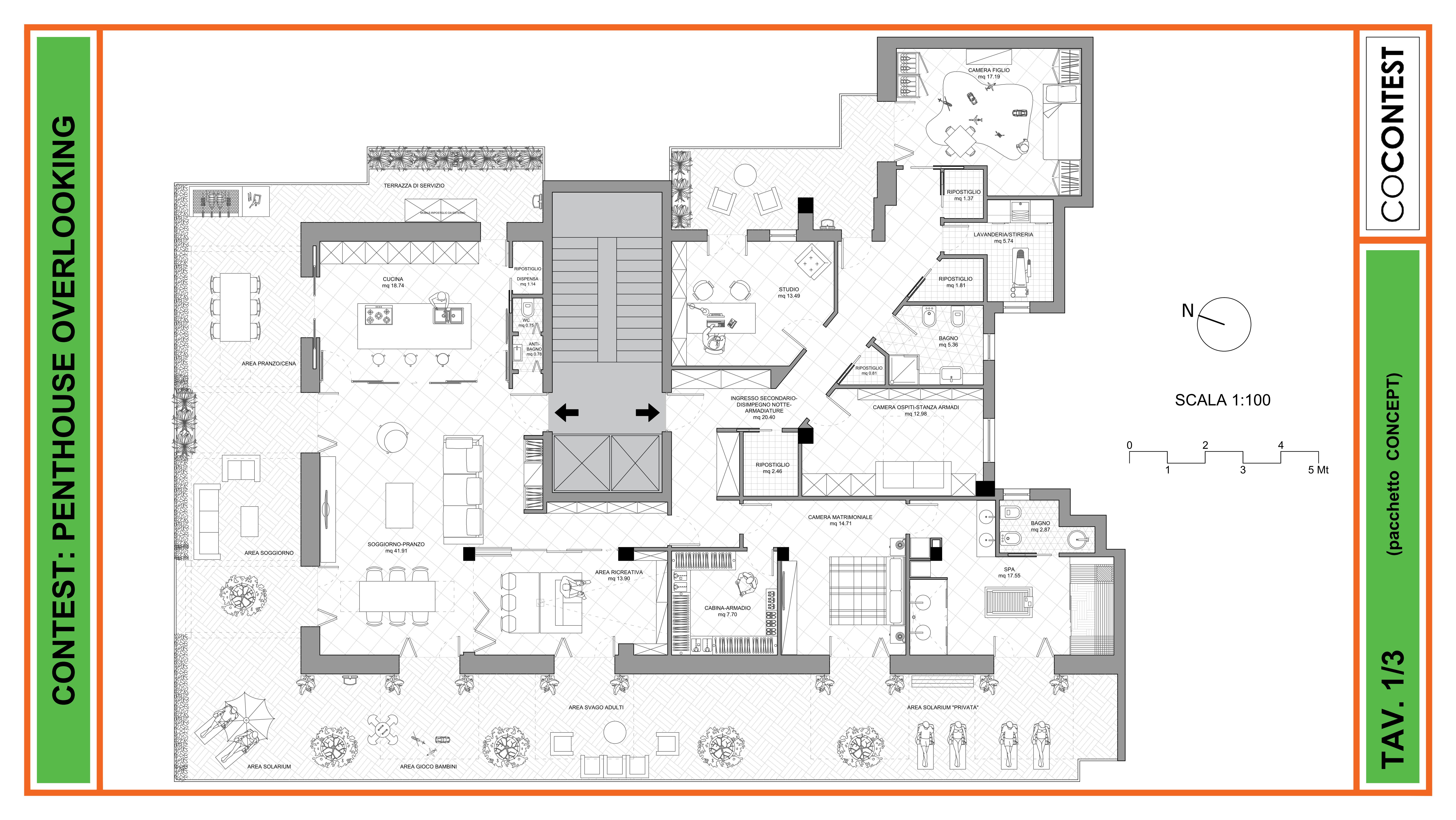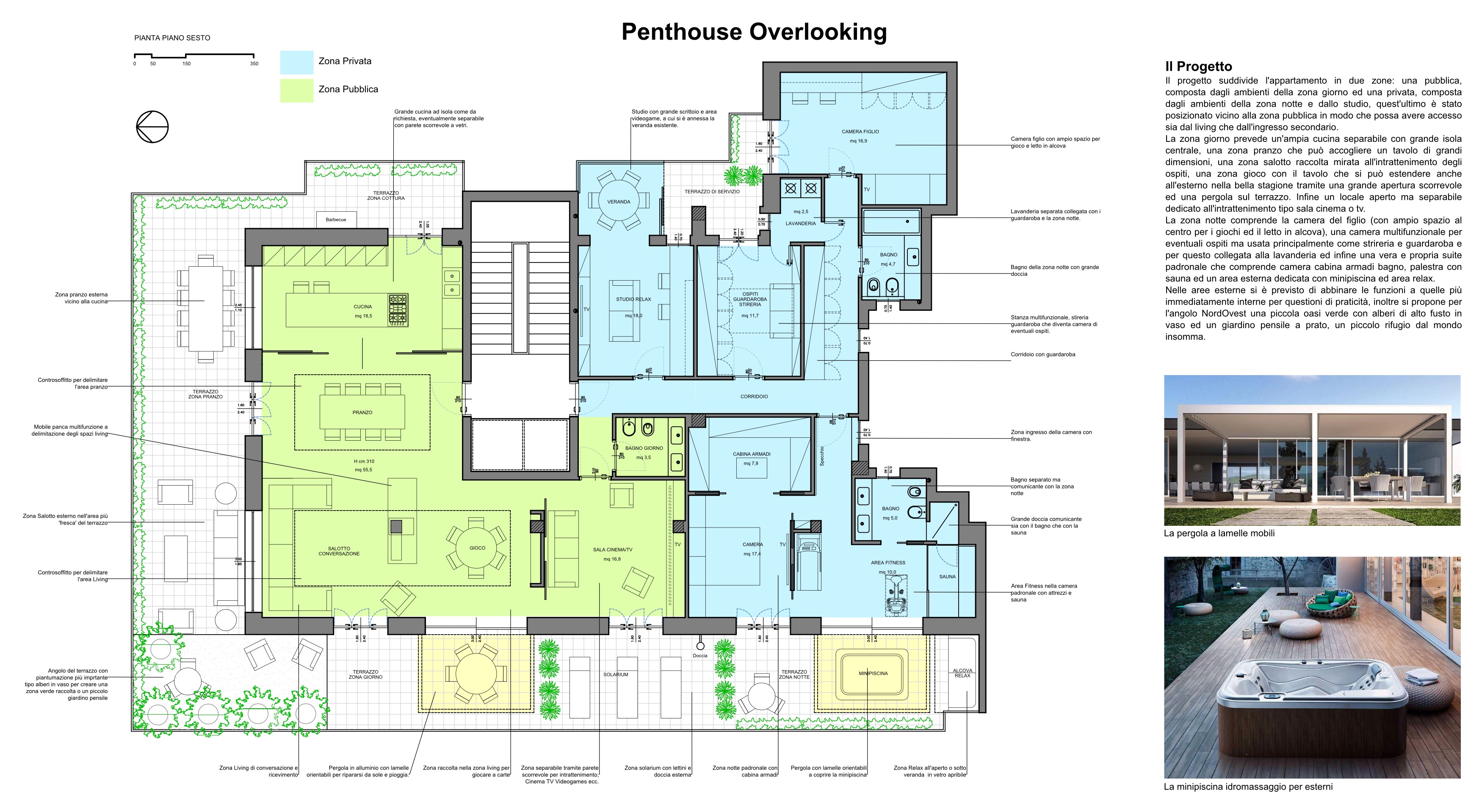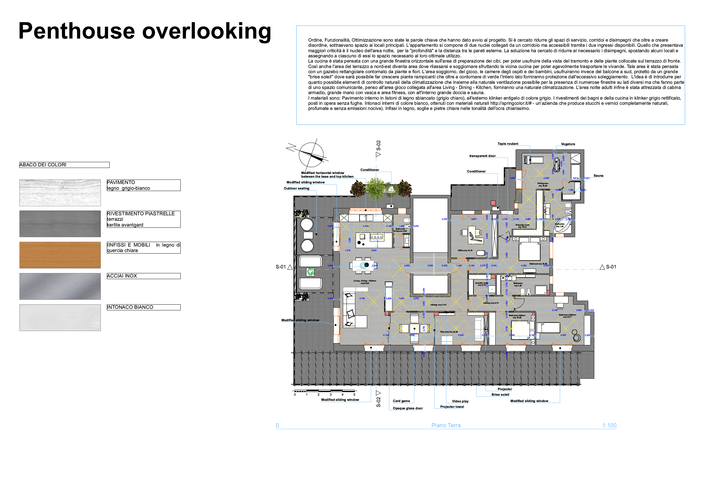 Gli altri ambienti sono: studio disimpegnato dalla zona notte, camera padronale con grande cabina armadio e bagno, una camere da letto per bambino, una camera palestra-ospiti, lavanderia-stireria, piccolo bagno zona living.