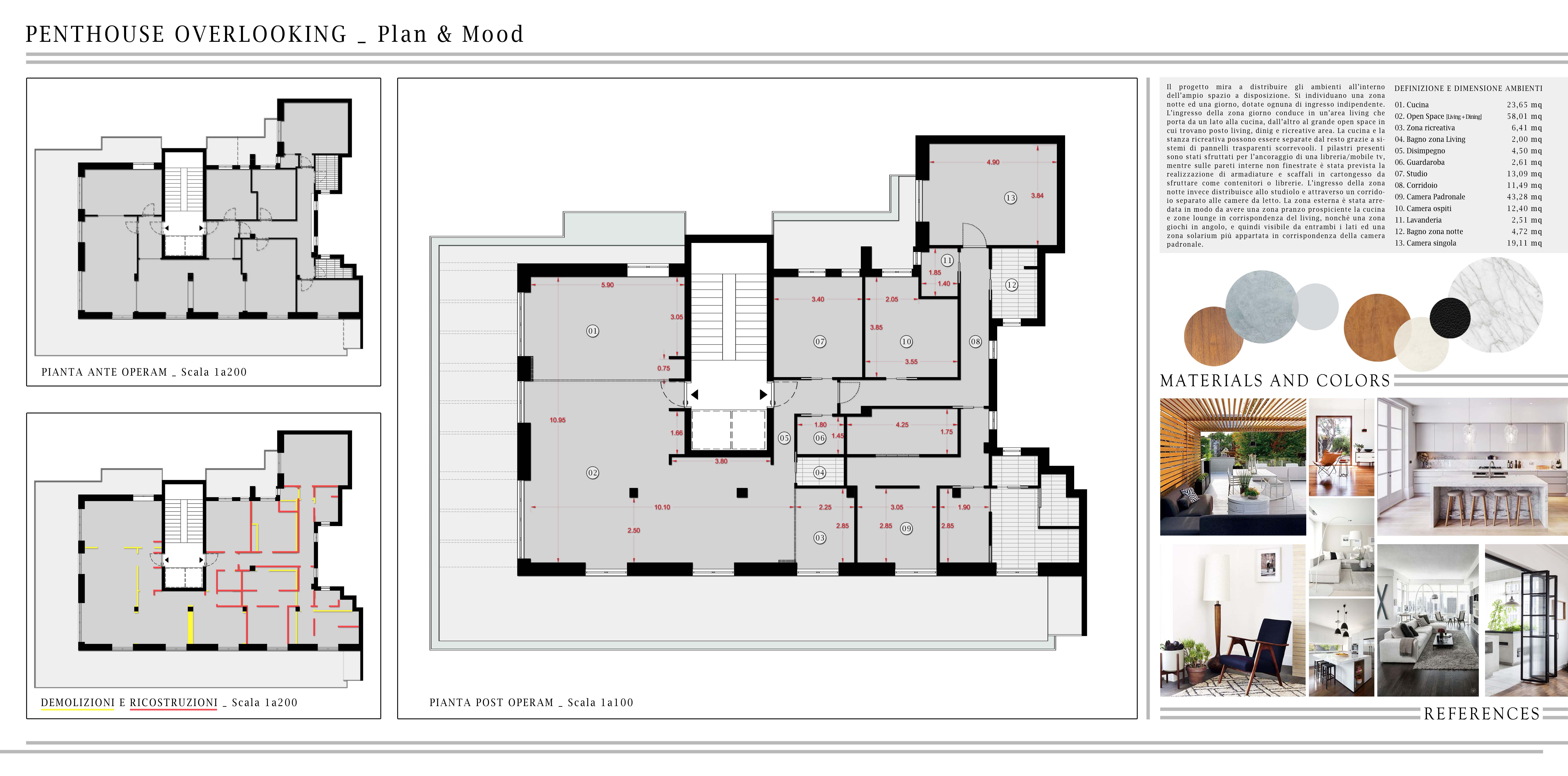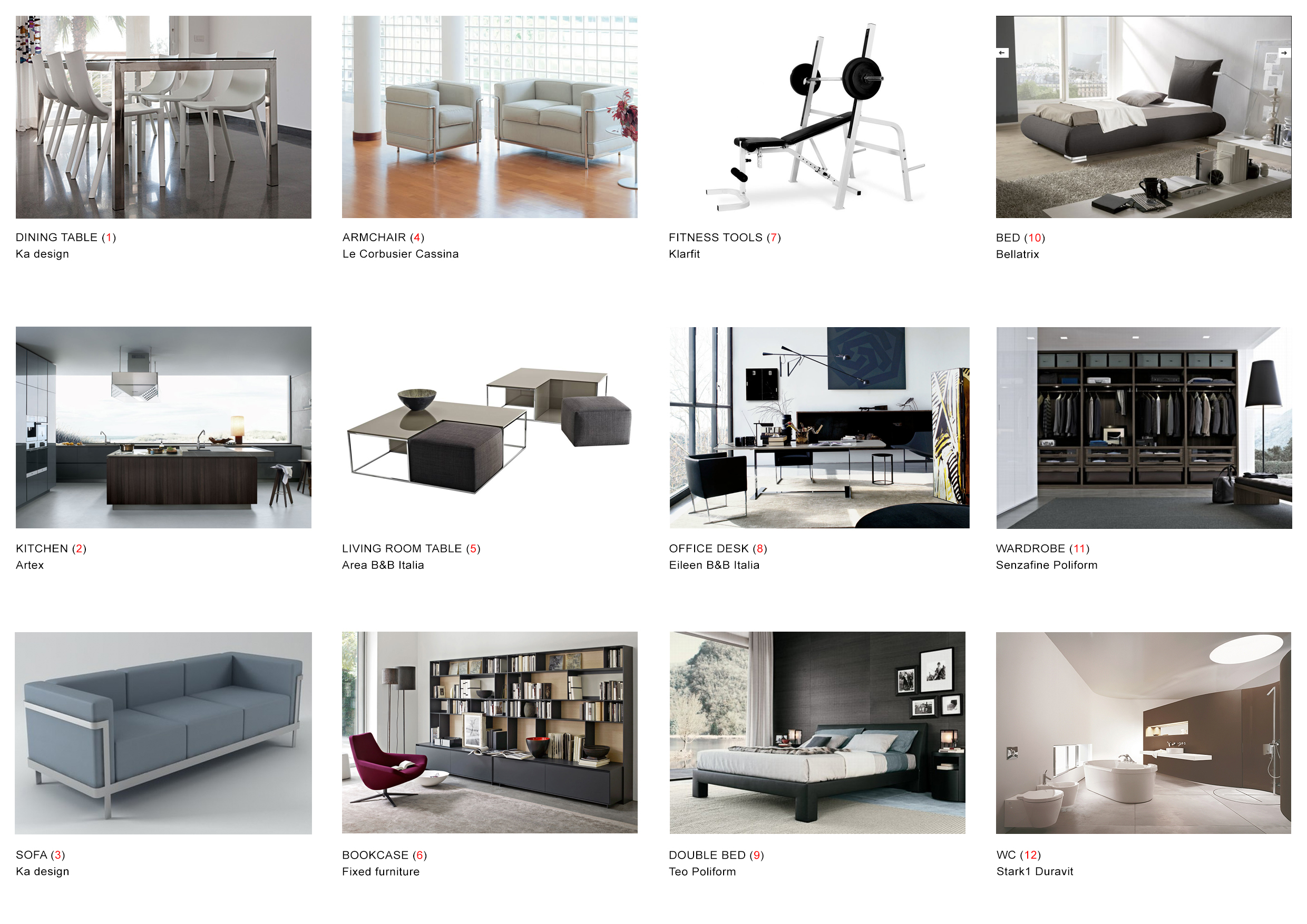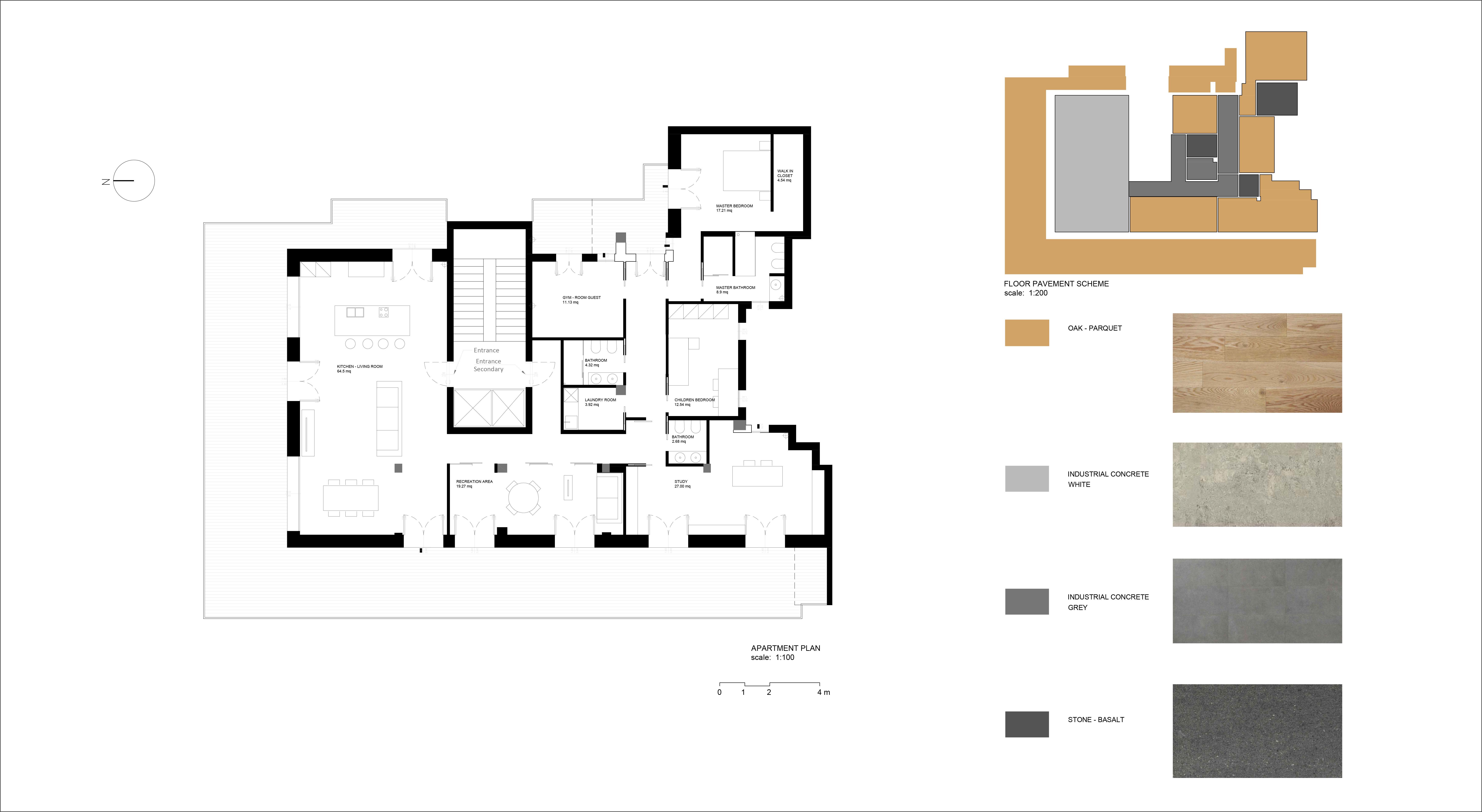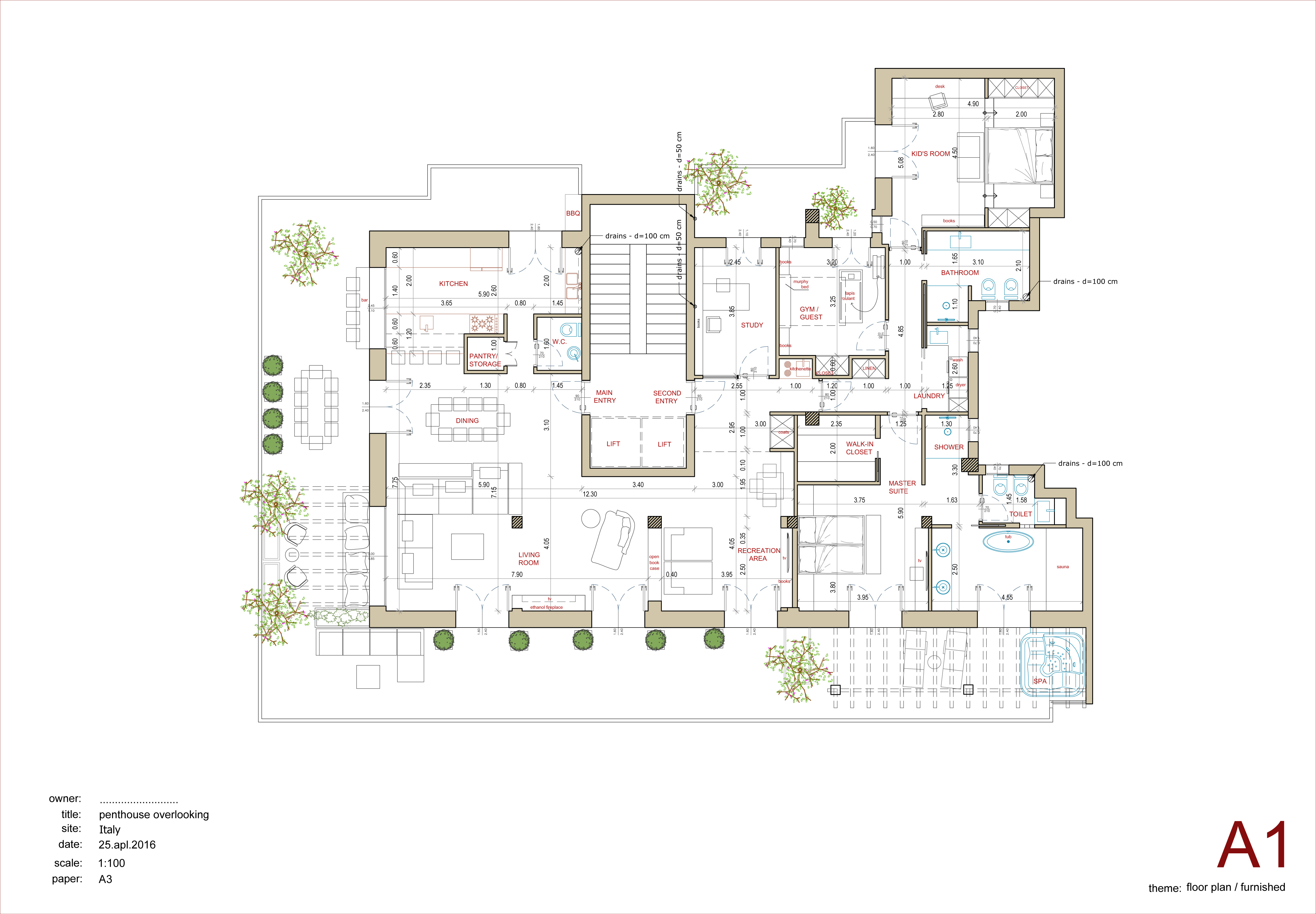 Gli altri ambienti sono: studio disimpegnato dalla zona notte, camera padronale con grande cabina armadio e bagno, una camere da letto per bambino, una camera palestra-ospiti, lavanderia-stireria, piccolo bagno zona living.