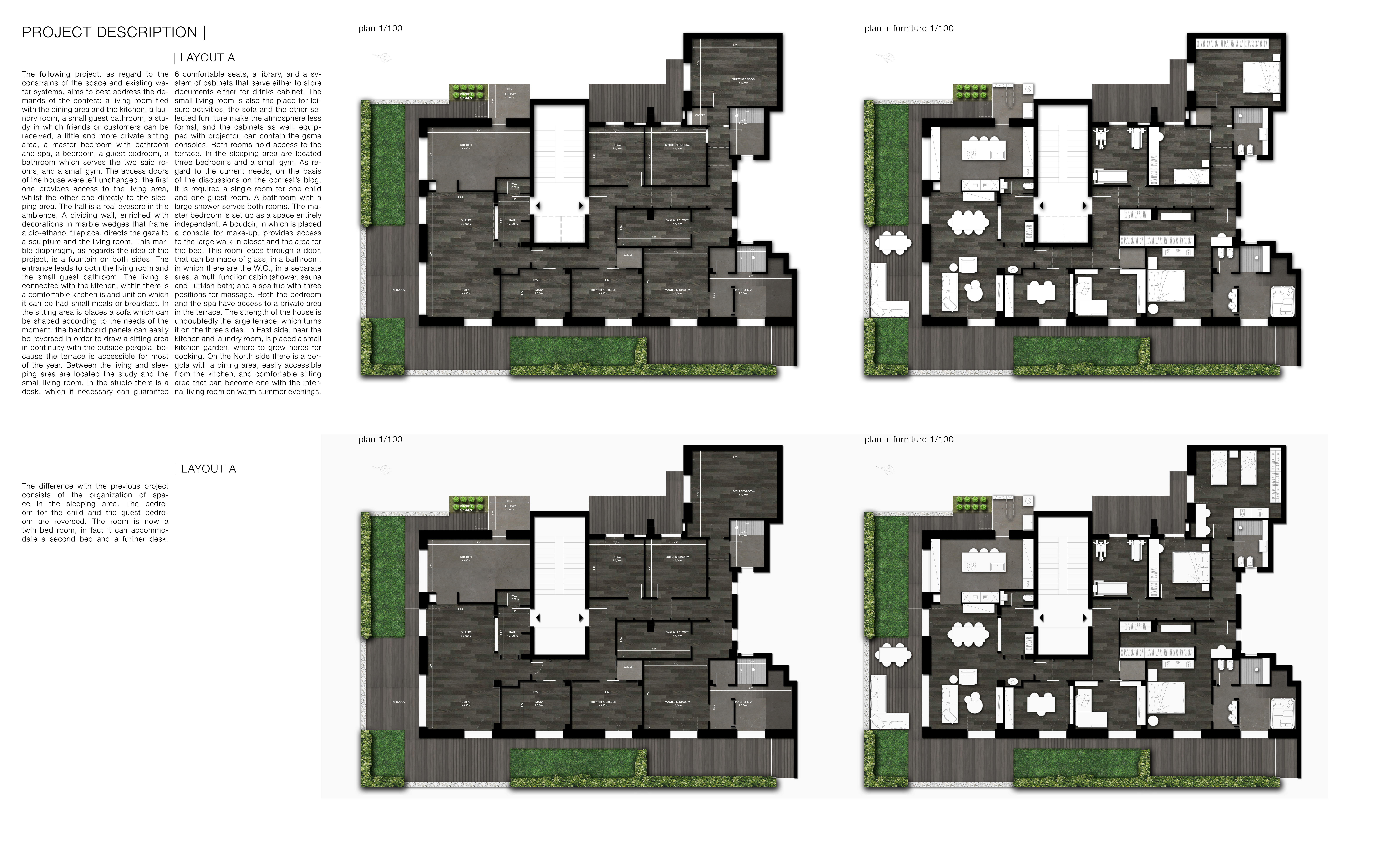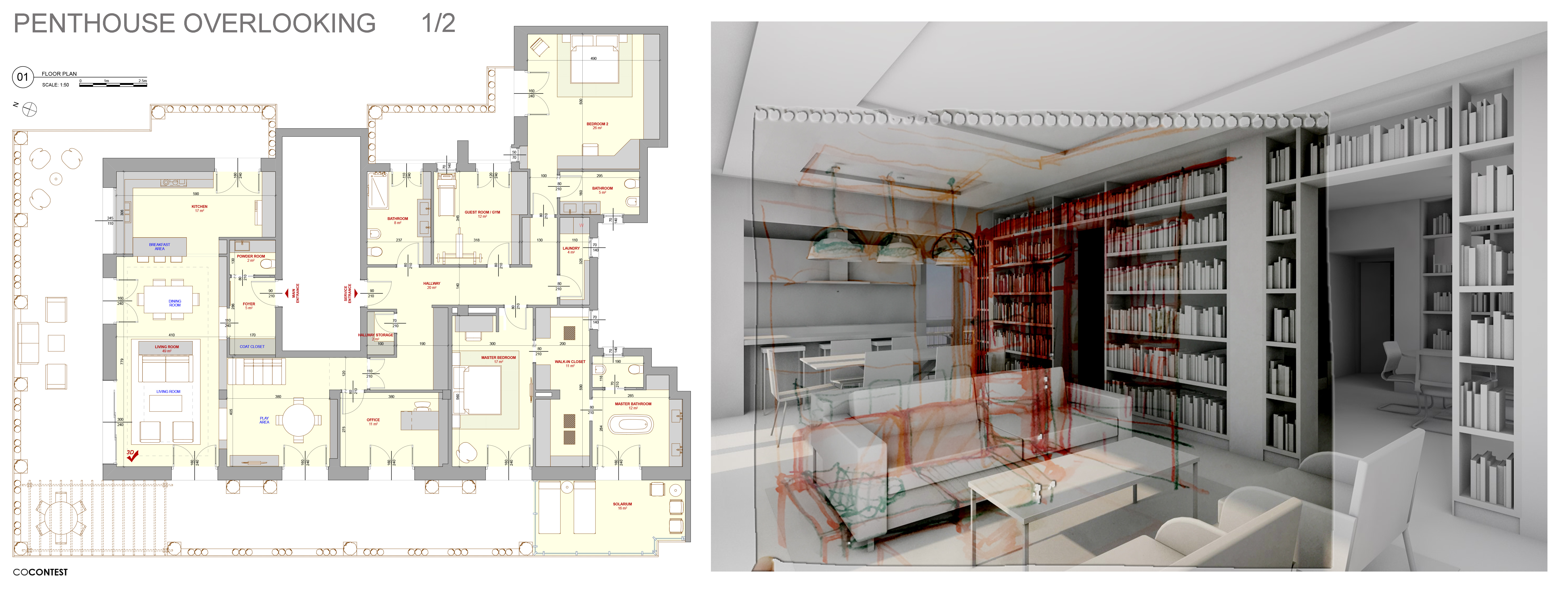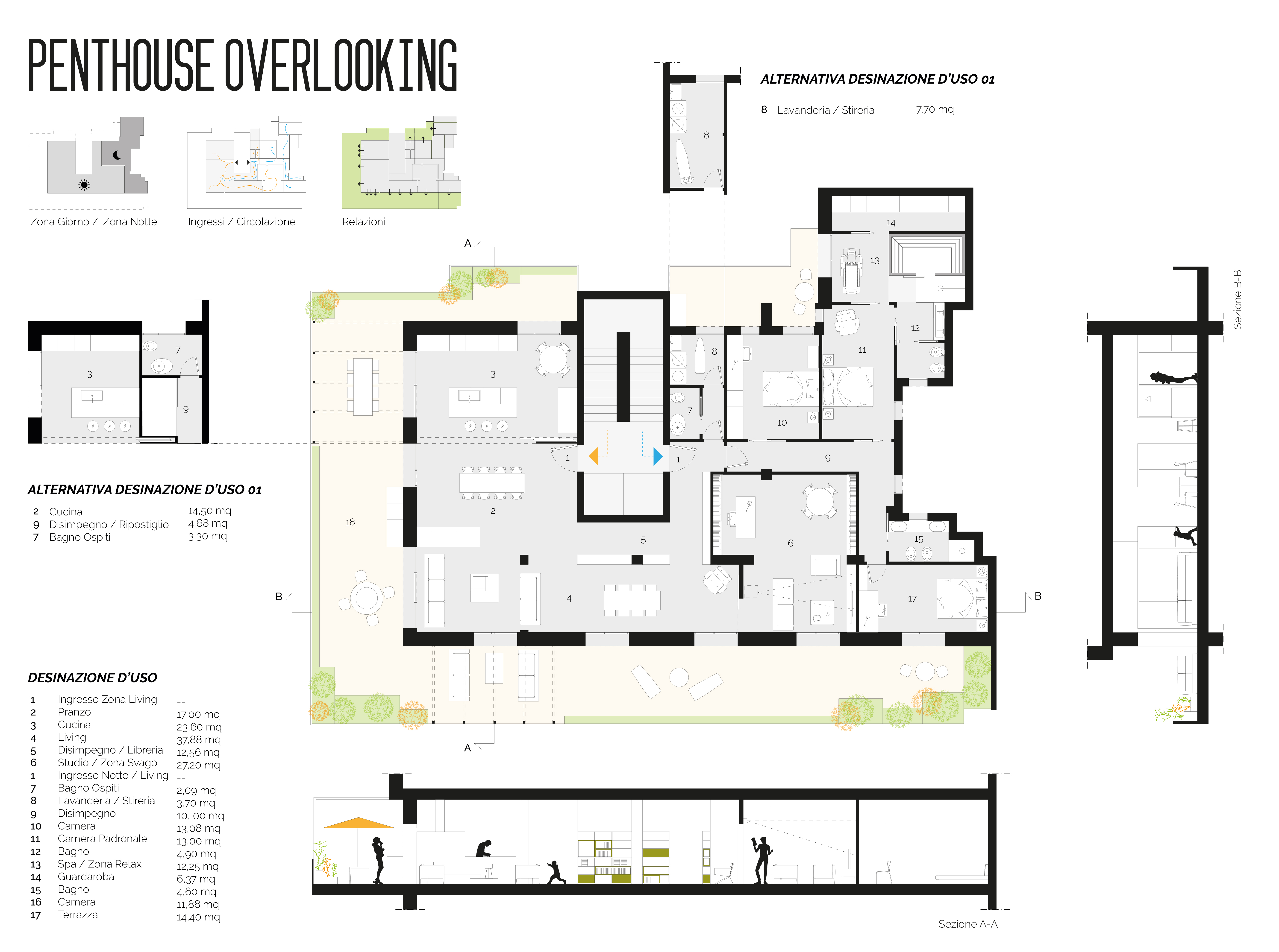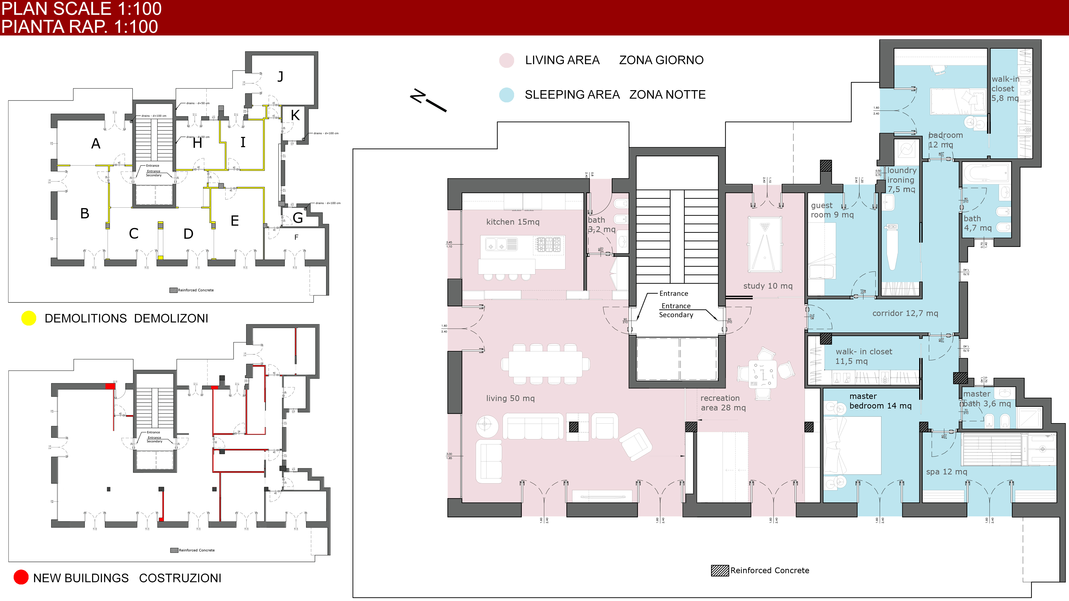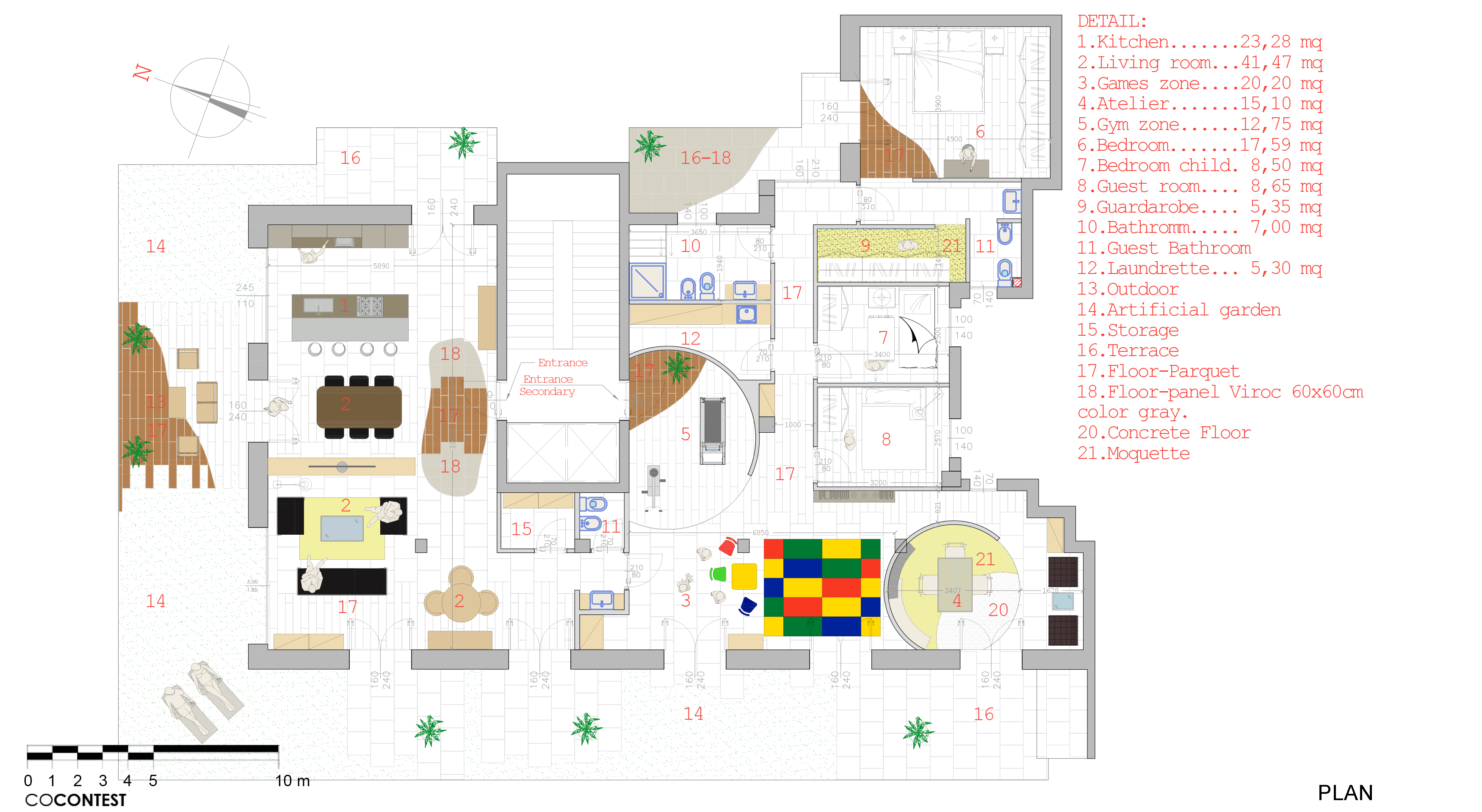 Gli altri ambienti sono: studio disimpegnato dalla zona notte, camera padronale con grande cabina armadio e bagno, una camere da letto per bambino, una camera palestra-ospiti, lavanderia-stireria, piccolo bagno zona living.