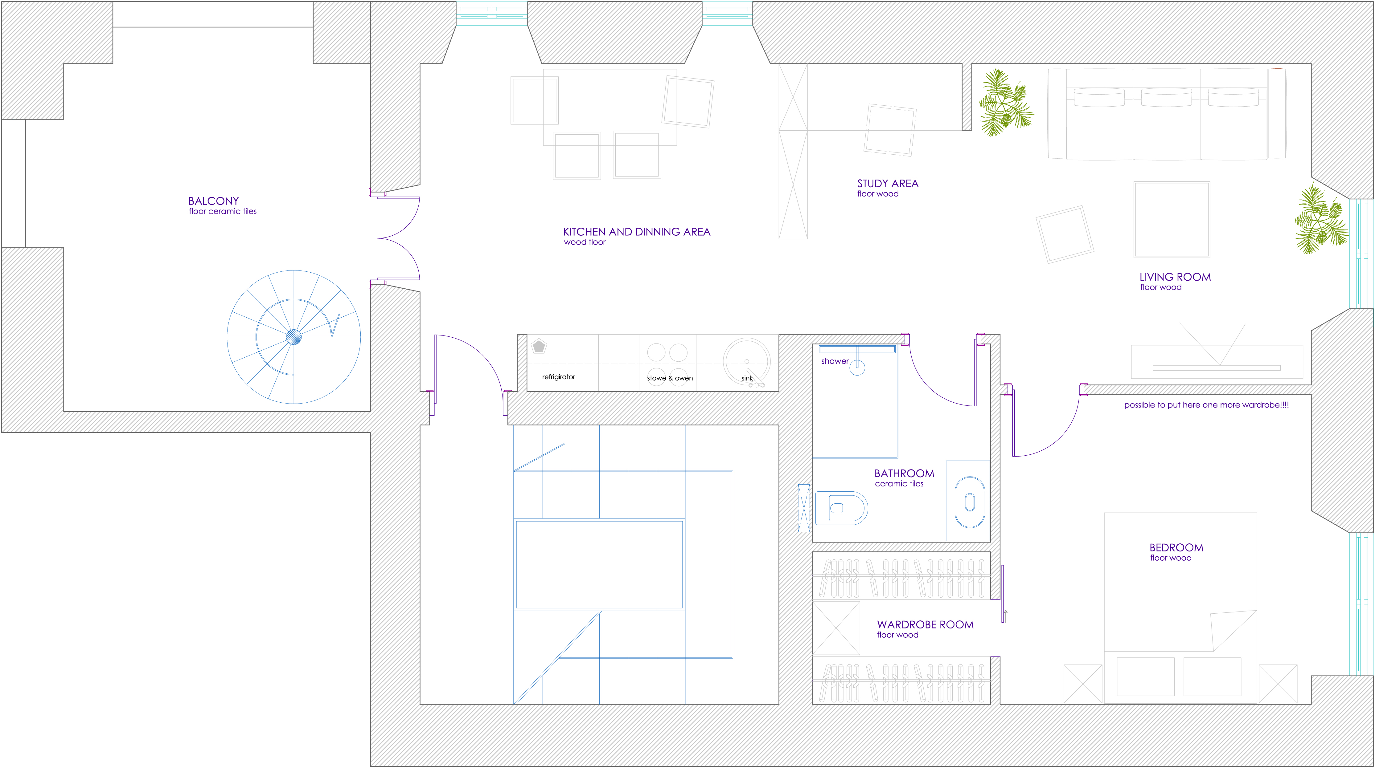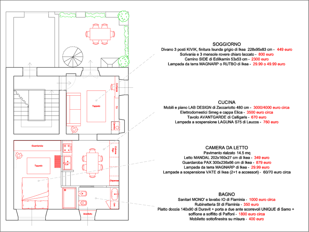 Apartment condition are as displayed in attached pictures and blueprints: we’ll have to break some walls down to better organize spaces; floor has to be renovated too. As for the spiral staircase, I find it extremely uncomfortable and non-practical, and I intend to switch to a different, more viable solution.