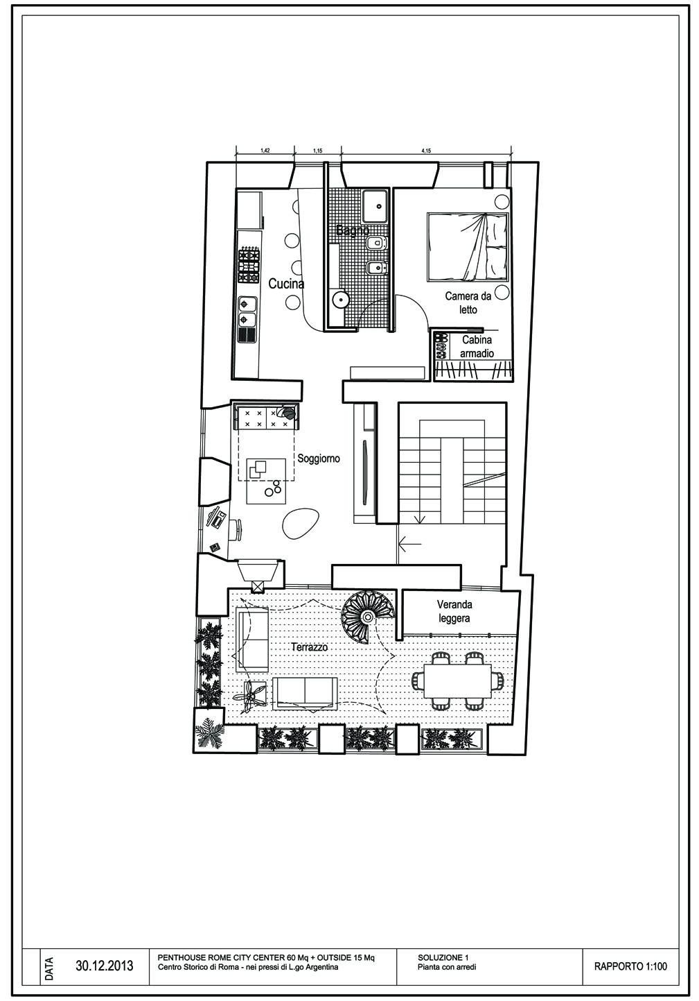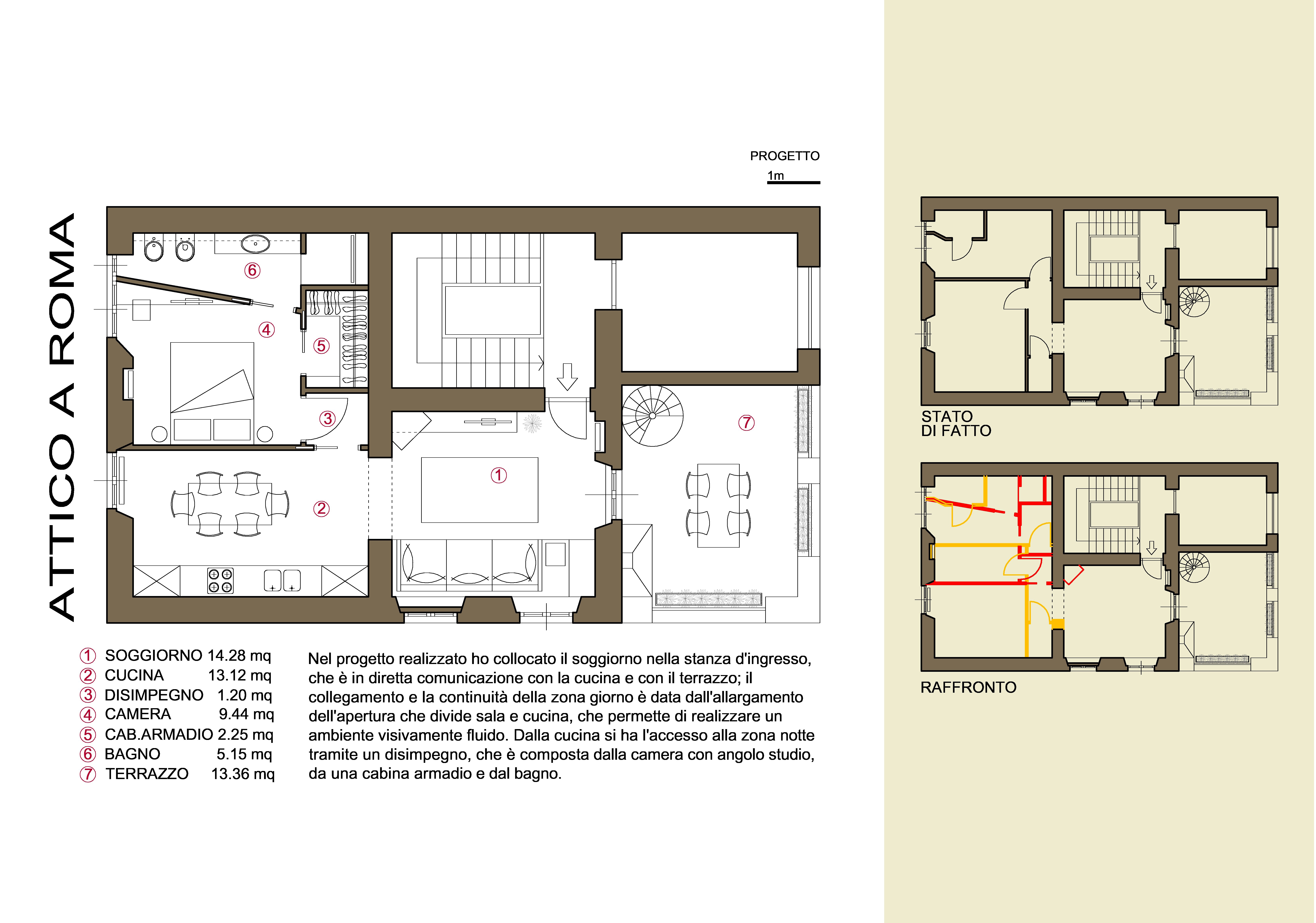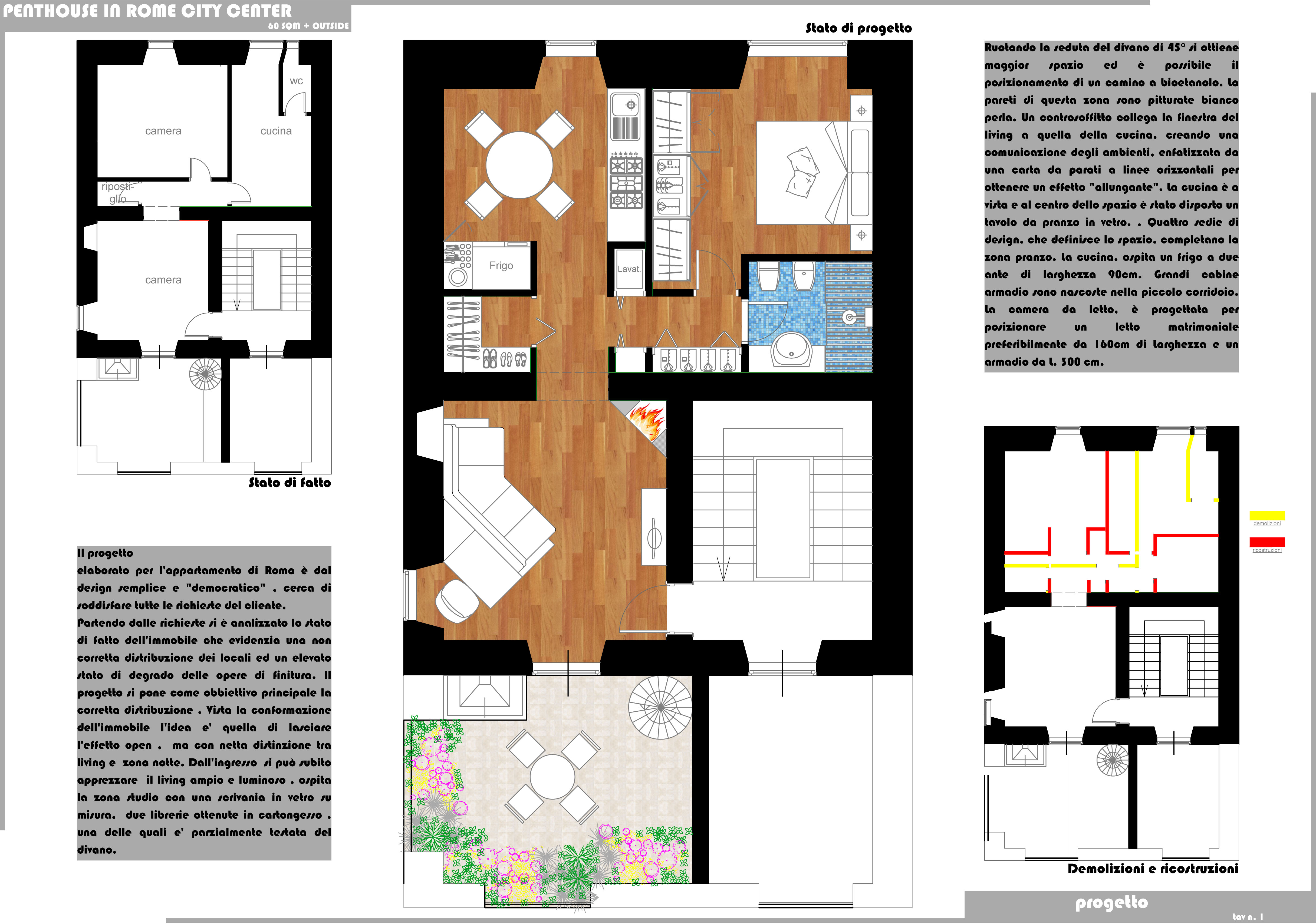 We’re talking about a penthouse in the very center of Rome, 60sqm (interiors) , height, 3.10m + a 15 m2 terrace (same floor) and 50 ,m2 terrace on the upper floor; the two terraces are connected by a spiral staircase.