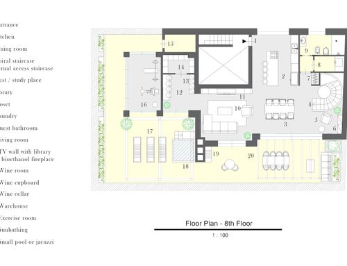 - All'8° piano esterno: zona pranzo esterna + zona barbecue (es. roshults) + piccola piscina + zona lettini/solarium + zona GYM
