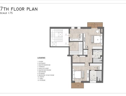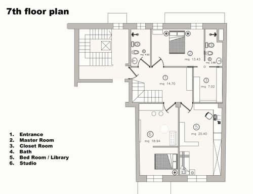 - on the 7th floor a master bedroom with 2 bathrooms and walking closet + a study room/single bedroom. Moreover a studio apartament with a dedicated entrance that can be reconverted into a one bedroom