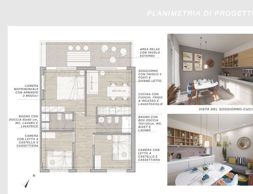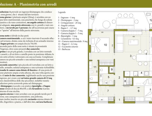 Il soggiorno deve avere l'accesso sul terrazzo. L'angolo cottura può essere inserito nel soggiorno e preferibilmente vicino al terrazzo e dovrà avere la lavastoviglie e la lavatrice.