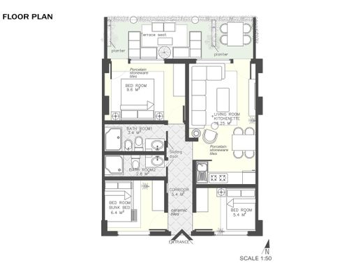 El salón debe tener acceso a la terraza. La cocina se puede colocar en la sala de estar y preferiblemente cerca de la terraza y debe tener lavavajillas y lavadora.