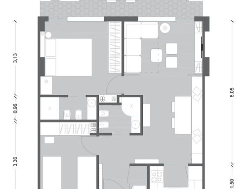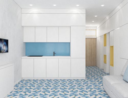 - living room with kitchenette with access to the terrace and double sofa bed. We do not want a separate kitchen but a kitchenette or kitchen wall equipped with a counter that has a sink, induction burners, dishwasher