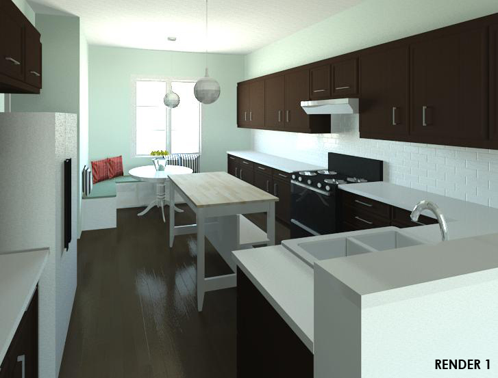 We will probably be resurfacing the existing cabinets in a darker color and replacing the linoleum with dark tile on the floor