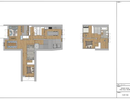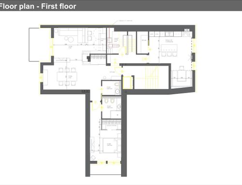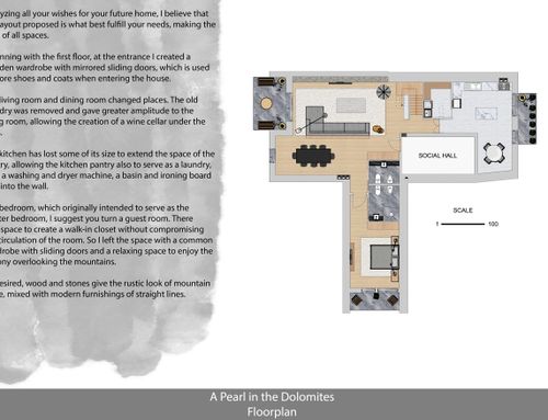 LIVING AREA: I’d like a wine-cellar/bar, mainly made of wood and stone and enlighten where now there is the office desk (see plan). I’d like a couch with chaise-longue near the wall that could be also used as a guest double bed. I’d like to place the dining area where you see the sofa in the plan. I’d like a wide table and a small tv cabinet (the tv is 65/75’’) in front of the couch; for the sofa, I’d prefer them to be gray. There is a pellets stove that I’d like to redecorate with stones in a typical mountain style. Particular attention should be paid to lighting, I’d like the house to be really bright and with warm light. I’d be grateful if in the lighting plan that I’ve purchased you could signal wall sockets and the position of all spotlights.