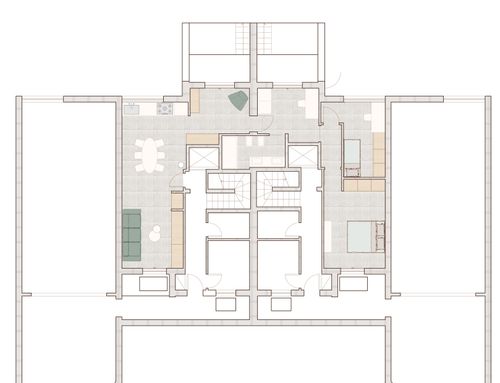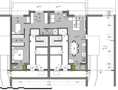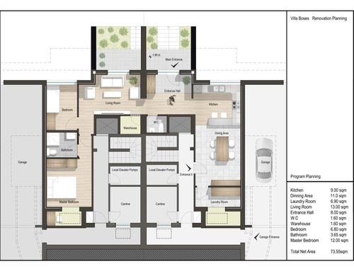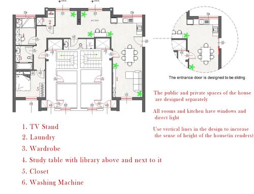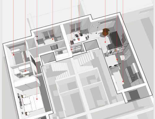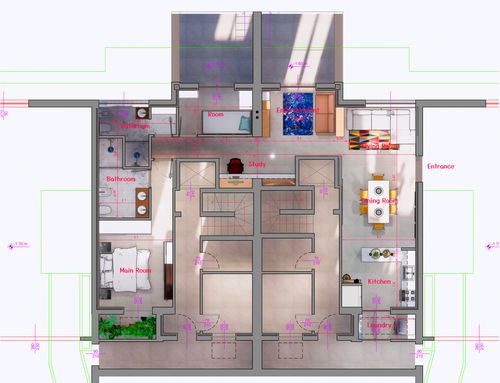 La necessità è ricavare un appartamento con due camere da letto, un bagno e una lavanderia oltre a zona giorno. L' ingresso di servizio dovrà avvenire da una dall' autorimessa di destra.