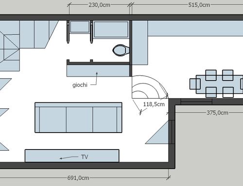In soggiorno vorremmo chiudere il sottoscala per realizzare un piccolo ripostiglio per mettere le scarpe e varie. Sempre in soggiorno vorremmo anche realizzare in un angolo uno scomparto filo muro in cartongesso per mettere cappotti e borse (appena si entra sulla sinistra ?).