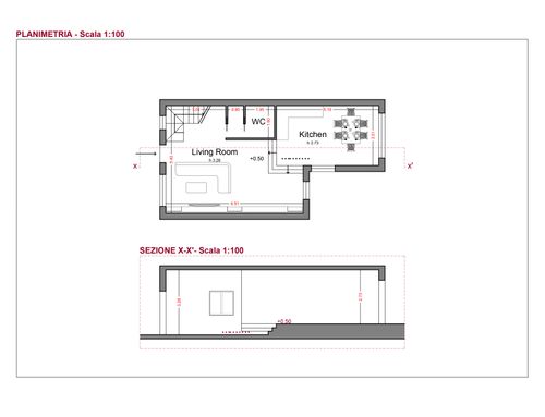 La stanza attualmente adibita a magazzino, e dove noi vogliamo spostare la cucina, ha un piano del pavimento più basso di circa 50 cm rispetto al soggiorno. Anche l'altezza delle due stanze è diversa. la cucina ha un altezza di 3.28 invece il soggiorno è alto 2.73.