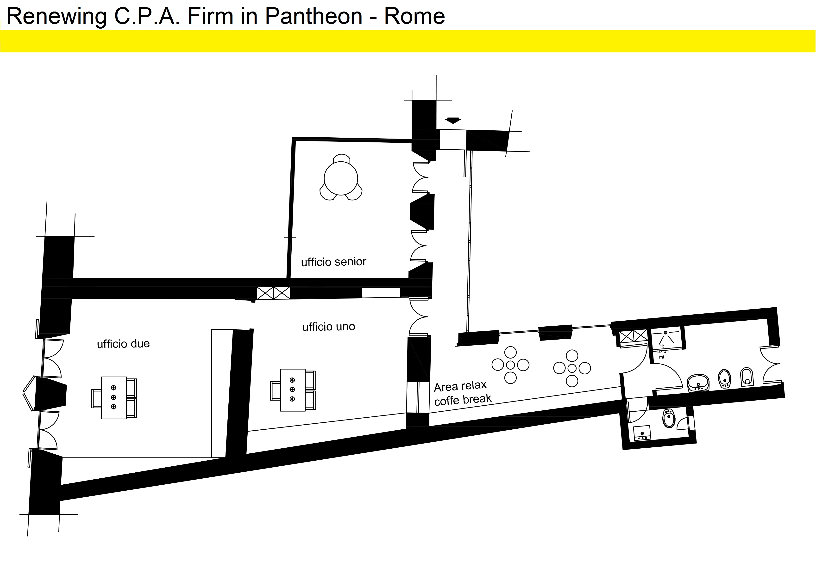progettazione spazio funzionale in cui devono lavorare 3/4 risorse. La terza stanza è per un senior che è sempre in movimento. le altre 2 stanze serviranno a personale dinamico e operativo. allestimento di piccola zona break (smallkitch) e 2 bagni. Si predilige arredo leggero e funzionale moderno possibilmente modulabile e colorato.