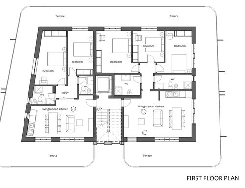 Of free inspiration, remodulate the floor plans in 2 apartment hypotheses per floor for the ground floor and the first, combining the two apartments on the street side into a single three-room unit (double bedroom, bedroom, 2 bathrooms, hall and kitchen); joining the 2 sea side apartments into a single four-room unit (3 bedrooms, 2 bathrooms, living room and kitchen); and a single apartment for the attic floor, uniting all four units. Design the interior and exterior furnishings of the building covered by the attached DWG. Use the measurements of the perimeter, exterior and interior walls of the project. Do not modify the entrance halls, the lifts, the garages, the exteriors of the gardens, and the condominium parts. Use warm colors compatible with buildings close to the beach. Use decorative greenery, which must be taken care of in every detail, and prefer plants and flowers typical of the geographical area that do not require excessive maintenance. Develop the 3d plans with the style and graphics of those attached, do not use different methods, the 3d plans must be developed on the basis of the remodulated plans, i.e. 2 on the ground floor with garden, 2 on the first floor with terrace and 1 on the attic floor. Develop the renderings of the external building located in the area, the renderings of the real estate units in the remodulated types only, as per request, of the terraces and private and condominium gardens.