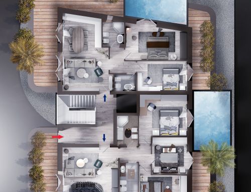 De inspiración libre, remodelar los planos en 2 hipótesis de apartamento por piso para la planta baja y el primer piso, combinando los dos apartamentos del lado de la calle en una sola unidad de tres habitaciones (dormitorio doble, dormitorio, 2 cuartos de baño, salón y cocina); combinando los 2 apartamentos del lado del mar en una sola unidad de cuatro habitaciones (3 dormitorios, 2 cuartos de baño, salón y cocina); y un solo apartamento para el piso del ático, combinando las cuatro unidades. Diseñar la decoración exterior e interior del edificio en el DWG adjunto. Utilizar las medidas de las paredes perimetrales, exteriores e interiores del proyecto. No modificar pasillos, ascensores, garajes, exteriores de jardines y partes del condominio. Utilizar tonos cálidos compatibles con los edificios cercanos a la playa. Utilizar vegetación decorativa, que debe cuidarse hasta el último detalle, y preferir plantas y flores típicas de la zona geográfica que no requieran un mantenimiento excesivo. Desarrollar los planos 3d con el estilo y grafismo de los adjuntos, no utilizar métodos diferentes, los planos 3d deben desarrollarse en base a los planos remodelados, es decir 2 en planta baja con jardín, 2 en planta primera con terraza y 1 en planta ático. Desarrollar renders de los edificios exteriores ubicados en la zona, renders de las unidades del edificio en los tipos remodelados únicamente, según se solicite, de las terrazas y jardines privados y comunitarios.