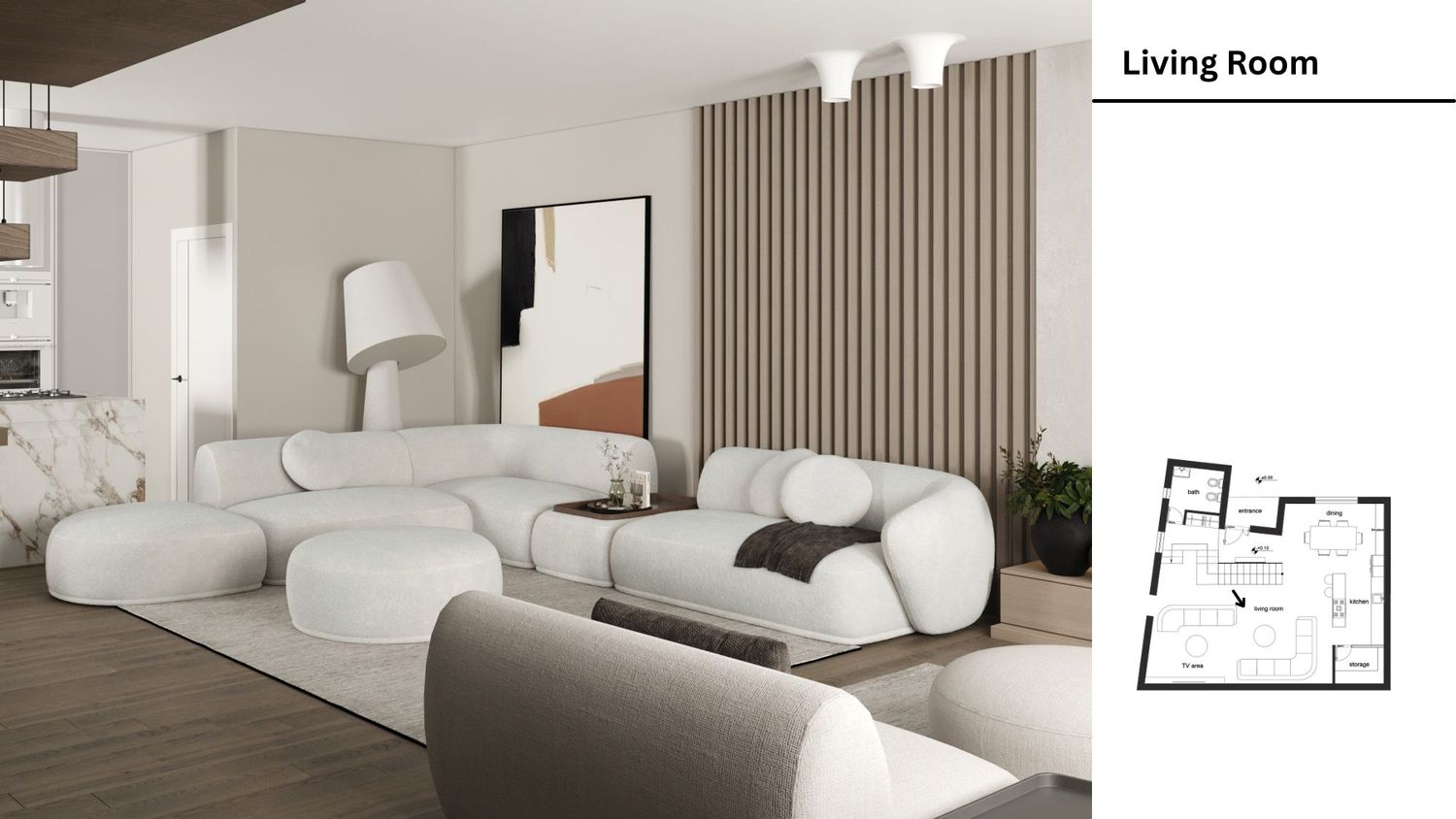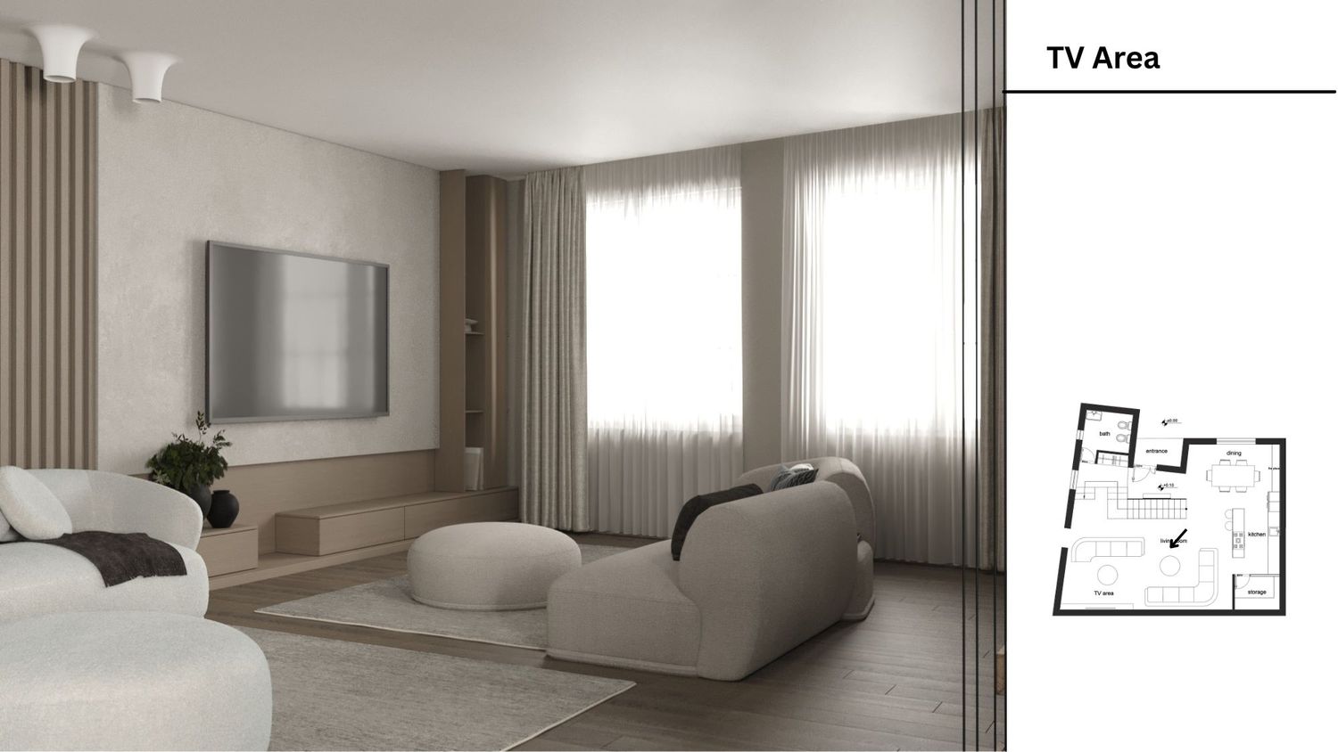 The dominant color palette of the project consists of white, natural wood tones, and subtle black accents. These black accent elements are introduced to enhance contrast and achieve visual balance within the space. The fabric selections for the furniture, the kitchen cabinetry, and the TV wall decorative elements are defined by white and neutral shades.