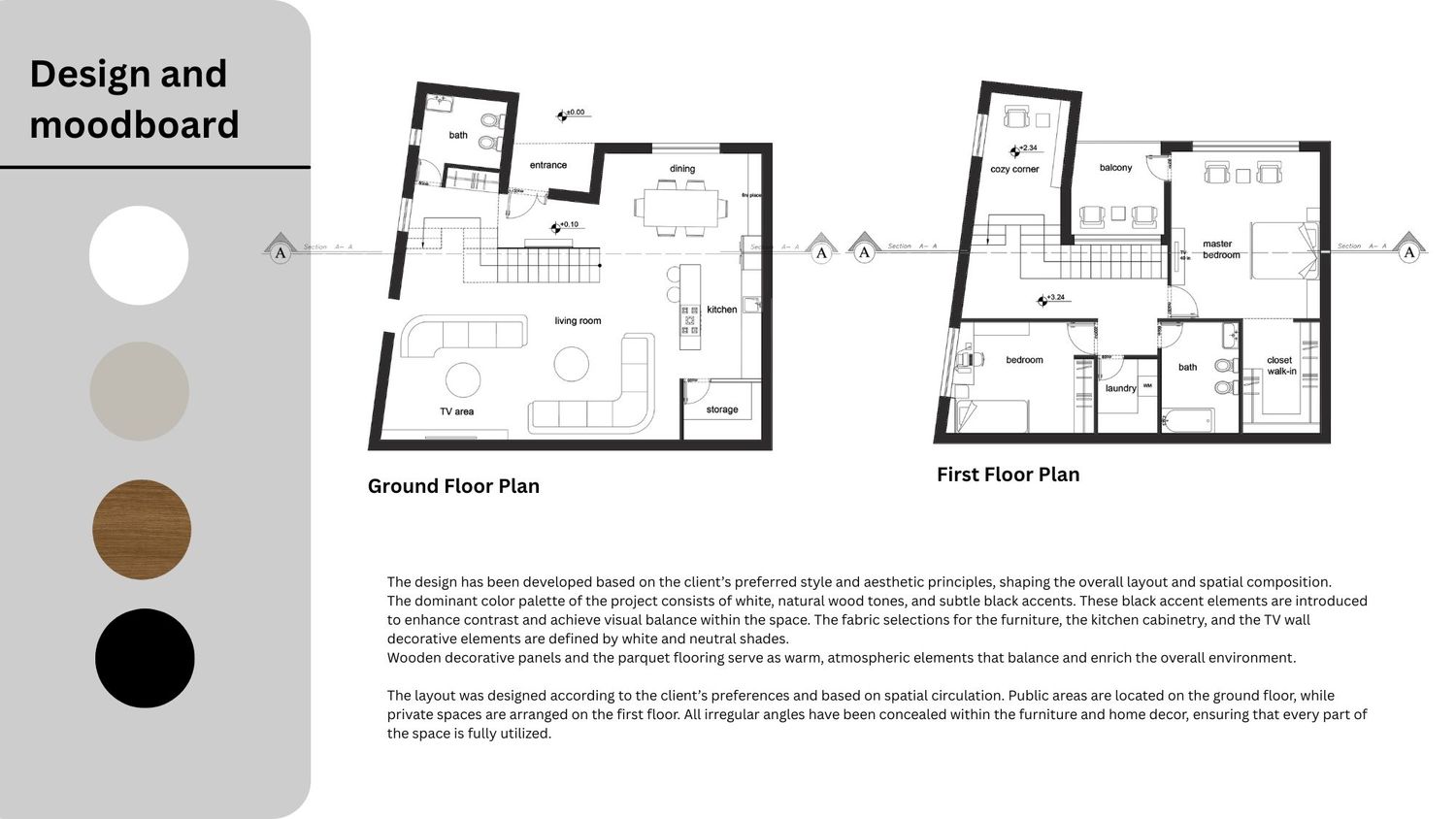 The layout was designed according to the client’s preferences and based on spatial circulation. Public areas are located on the ground floor, while private spaces are arranged on the first floor. All irregular angles have been concealed within the furniture and home decor, ensuring that every part of the space is fully utilized.