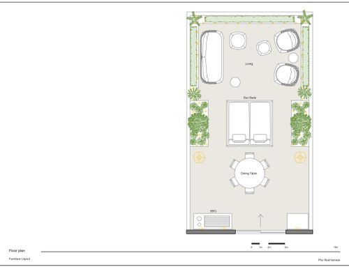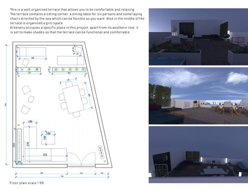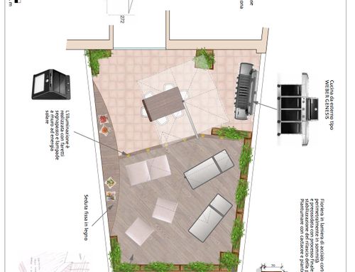 BBQ, Dining area (table and chairs for 4 to 6, sunbeds (2) and living; some plants and light (solar energy as there is no electricity)