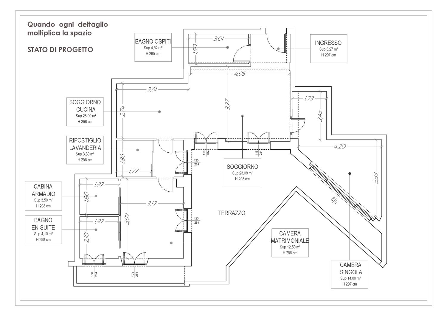 Nel suo assetto originario, l’abitazione rispecchiava una distribuzione piuttosto tradizionale: zona giorno con soggiorno centrale, cucina separata e bagno di servizio e zona notte con due camere e un bagno. Un impianto estremamente funzionale ma dove la presenza di corridoi risultava piuttosto importante ai fini della distribuzione.