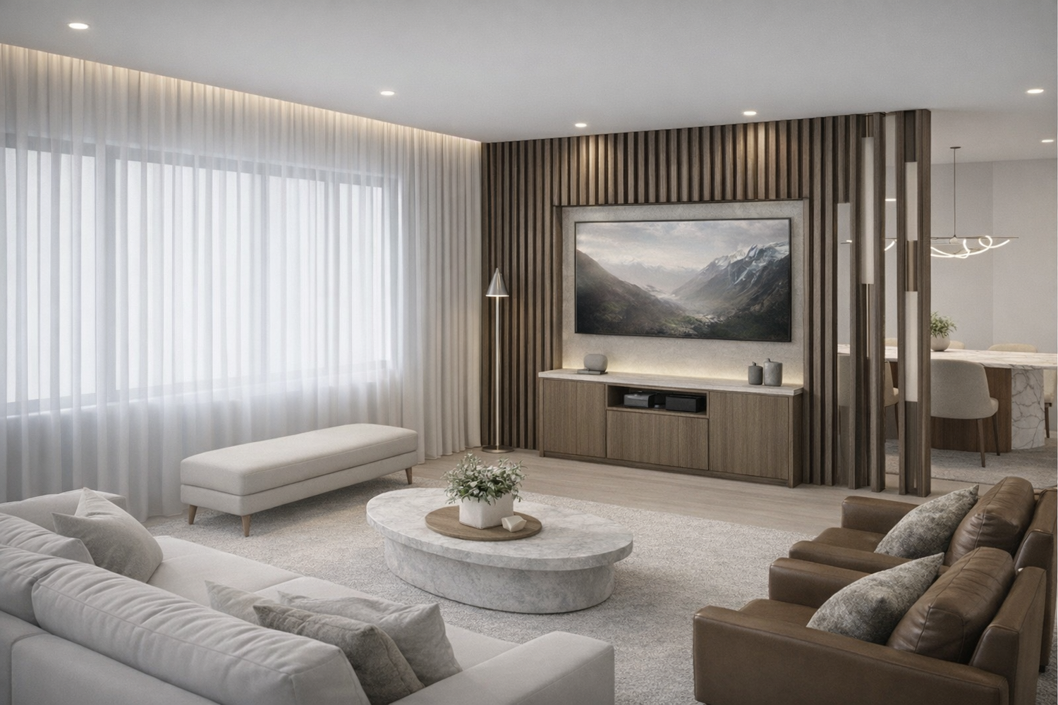 I’ve separated the living room from the dining area using a contemporary wooden partition that elegantly integrates the TV screen. This design element defines each zone while maintaining visual flow. Both areas feature a modern, sophisticated aesthetic that creates a cohesive entertaining space.