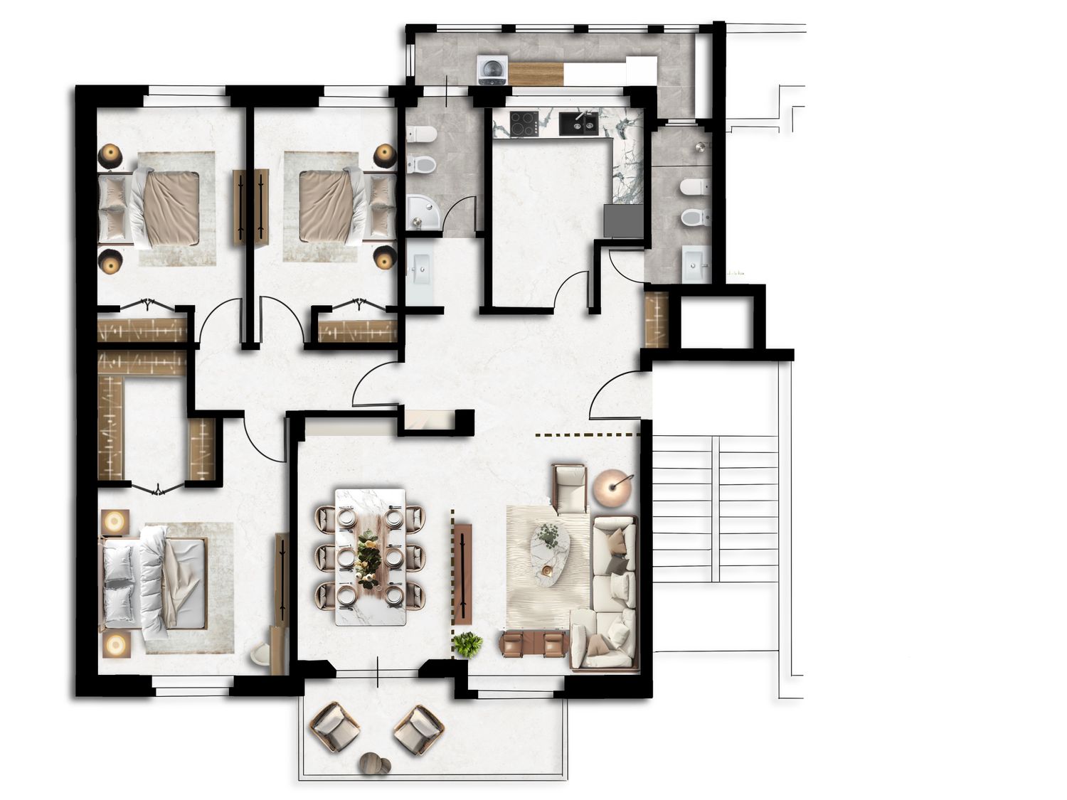 Each bedroom includes a dressing area sized appropriately to meet storage needs. Importantly, the master bedroom’s dressing area has been intentionally designed with future adaptability in mind—should you wish to convert it into an ensuite bathroom down the line, the layout fully accommodates this transformation without major structural changes.