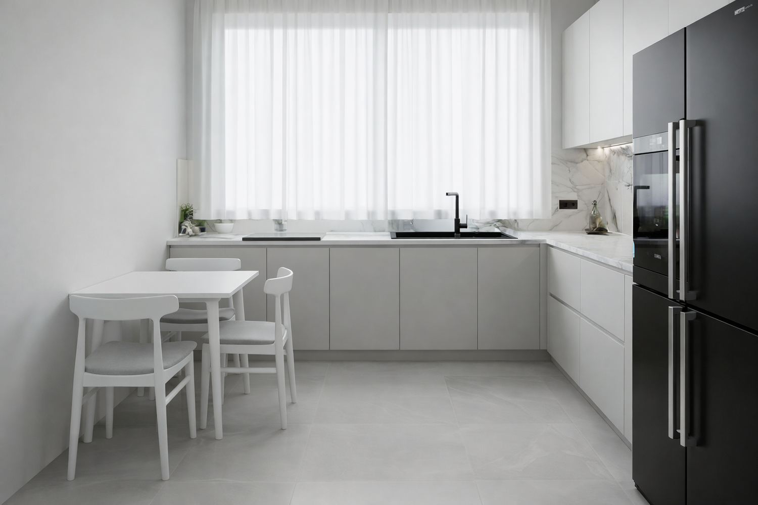 The kitchen has been configured in an L-shape layout to optimize workflow and counter space. A large window floods the area with natural light, and I’ve included a small dining table for casual meals and morning coffee—creating a cozy, functional breakfast nook.