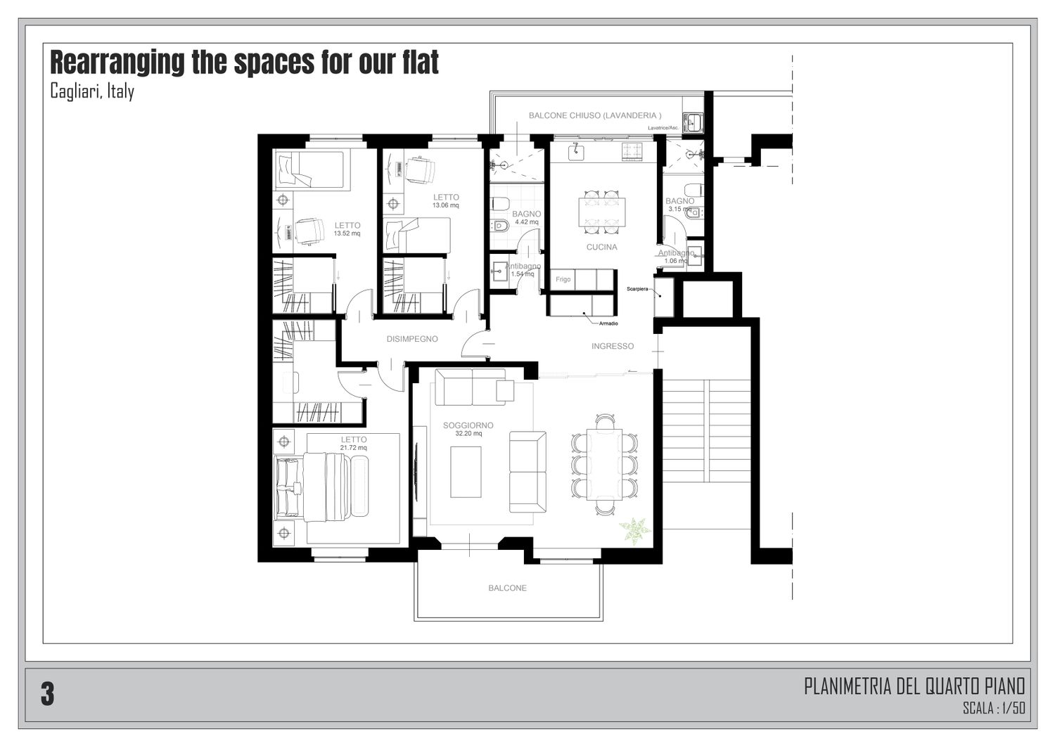 In questo progetto, partendo dallo stesso set di requisiti, abbiamo sviluppato tre diverse alternative planimetriche per permettervi di valutare il potenziale dello spazio da diverse prospettive. Ogni opzione rispetta rigorosamente le normative italiane (regolamento edilizio per l'antibagno) e mantiene l'integrità delle colonne di scarico esistenti.