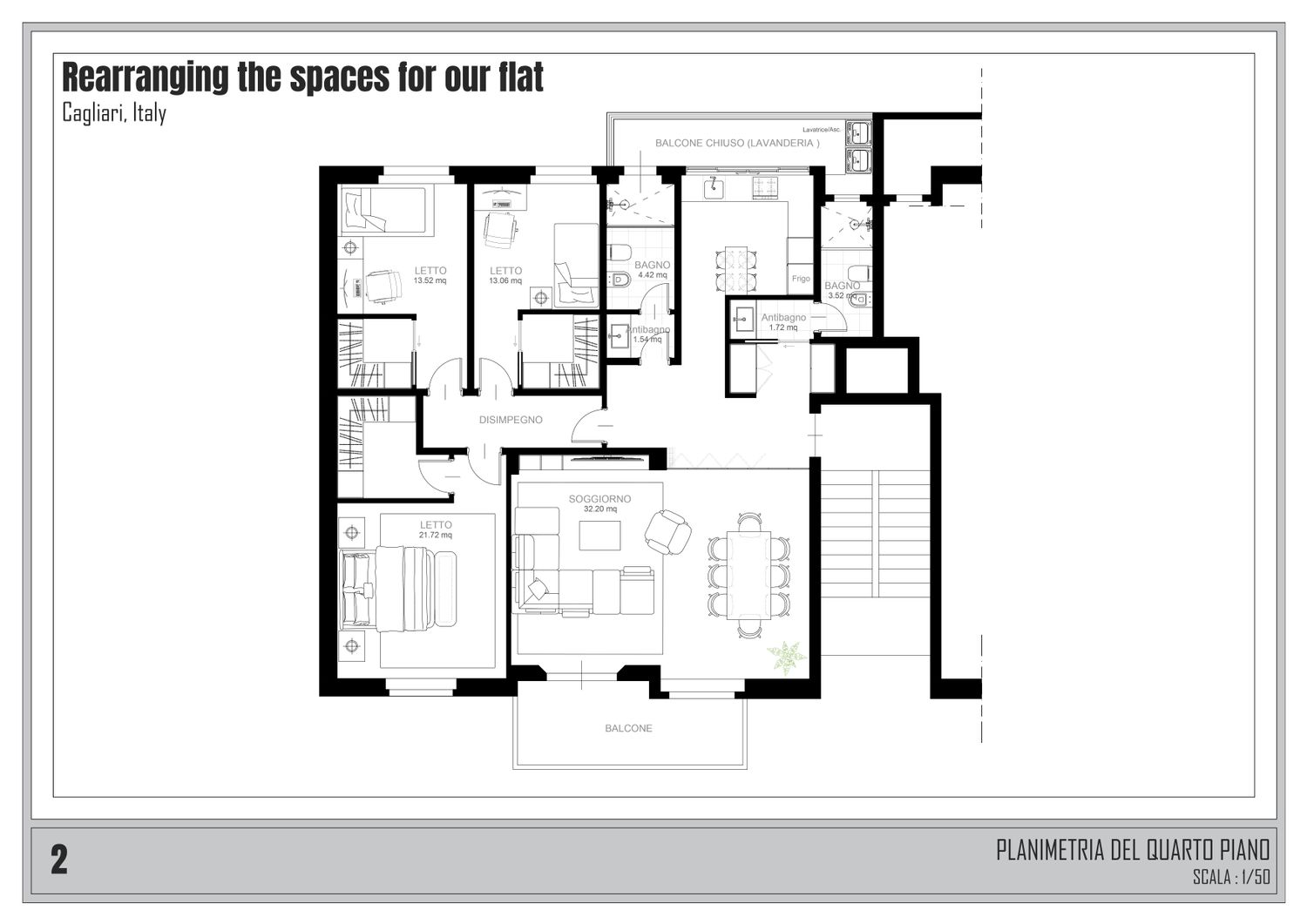 Zona Notte e Contenimento: Abbiamo lavorato su tre diverse varianti per le dimensioni delle camere da letto e la disposizione delle cabine armadio, intervenendo sulle murature esistenti solo dove strettamente necessario.