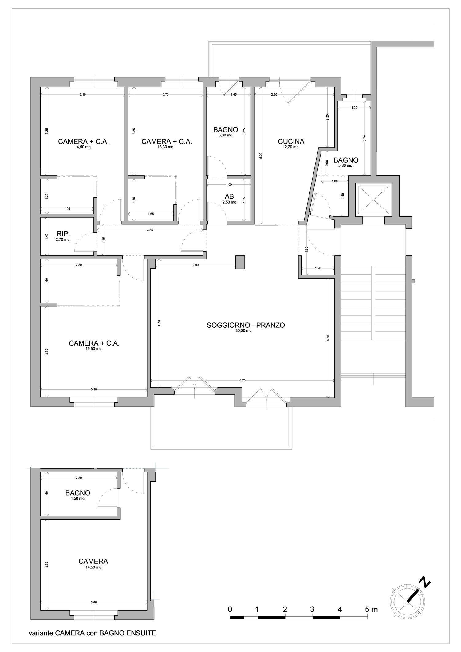 5. Modifica e leggero rimpicciolimento del disimpegno, a favore delle camere e del bagno principale;