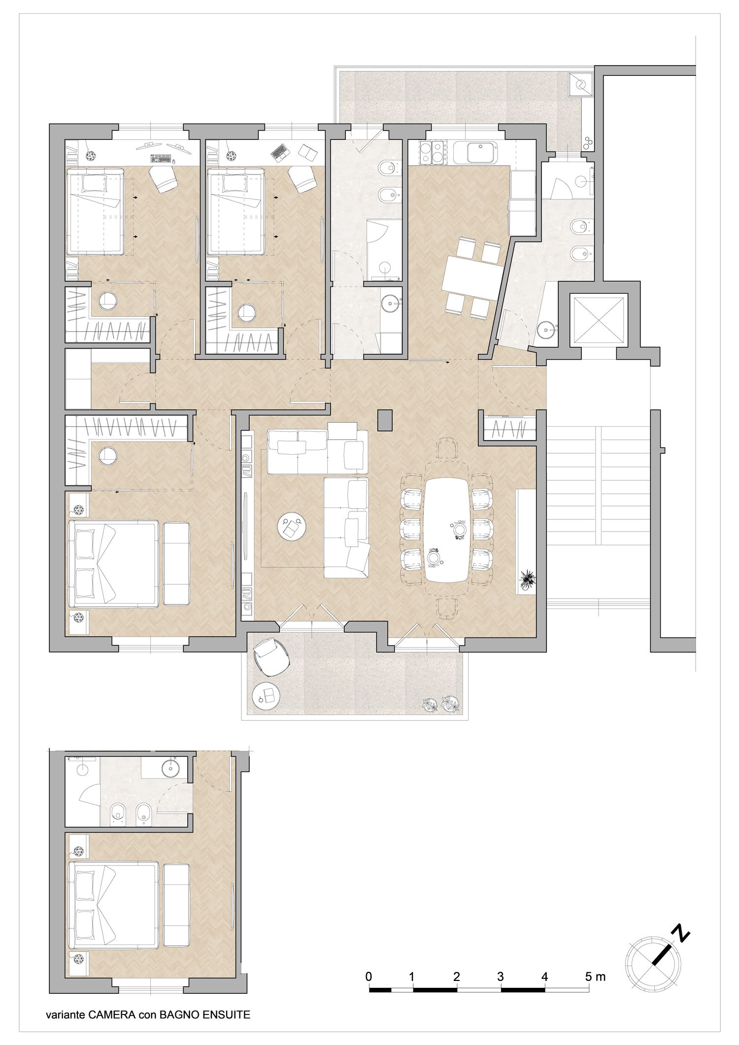La cabina armadio posizionata all'interno della camera matrimoniale potrà essere dotata delle predisposizioni impiantistiche necessarie per la futura trasformazione in bagno con limitate opere murarie (cfr. proposta di variante con bagno ensuite).