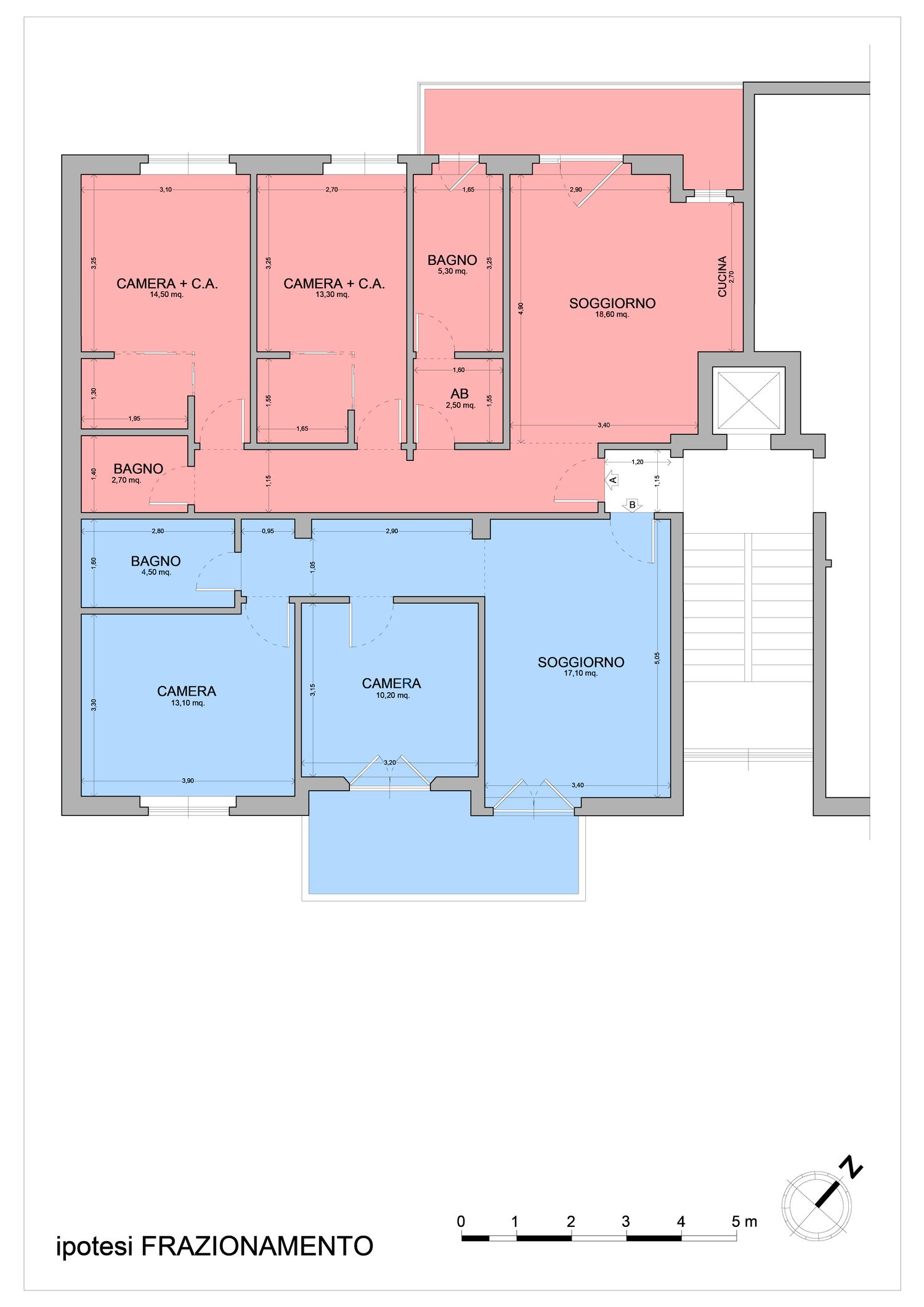 La nostra proposta include anche un'idea di massima per il futuro frazionamento in due unità separate, con opere murarie limitate al minimo indispensabile (e lo sfruttamento delle posizioni di tubazioni di adduzione e scarico pe contenere i costi di ristrutturazione).