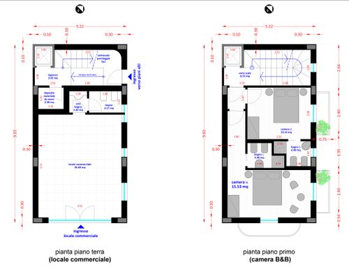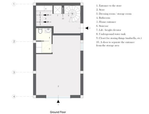 3. Maintain the commercial activity that is already present on the ground floor. It is necessary to guarantee a small bathroom even without a window (toilet and sink) and a small room as a dressing room / storage room and an entrance like the present one.