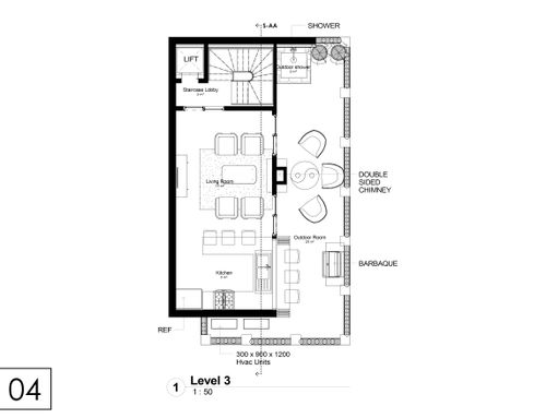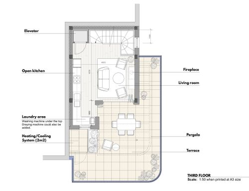 9. The third floor will also be used exclusively by the owners and will be 50% or more closed with a flat roof to be used as a kitchen and a small living room. The kitchen must be functional, taking advantage of every small space. A small laundry room would be necessary and a very small fireplace would be appreciated. The kitchen will be used exclusively by the family. The remaining part of the usable surface will be used as a terrace.