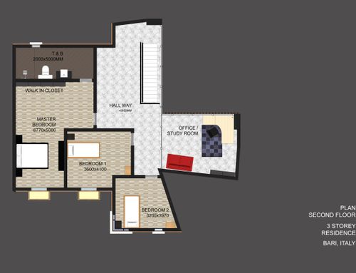 Il secondo piano sara’ zona patronale collegata all’edificio attraverso il porticato per tutto il suo sviluppo verticale fino al secondo piano, con la zona notte composta da 1 camera matrimoniale con bagno, 2 camerette e bagno di servizio con affaccio zona giorno attraverso balconata e scalinata di collegamento al primi piano. Zona giorno che si sviluppera' al primo piano per la porzione superiore al portico (il resto e' adibita a B&B) con cucina, soggiorno, studio, bagno di servizio, lavanderia e terrazza con scala esterna che portera' al giardino che costituira' anche l'ingresso come scritto sopra.
