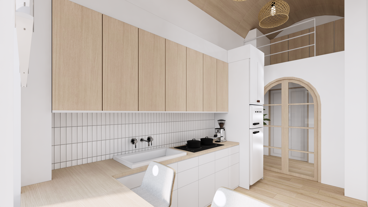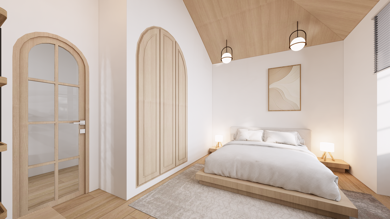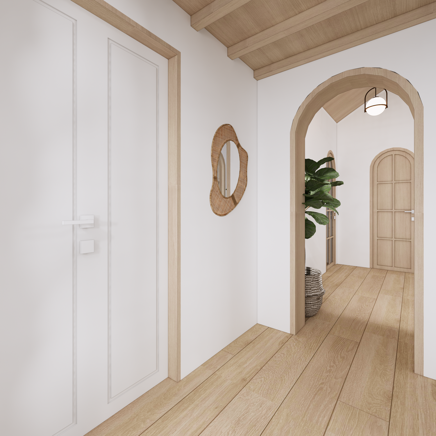 There are two bedrooms, one large and one small, each with built-in wardrobes. In the entryway, you can see many changes to the door and kitchen. I created a design dominated by white and wood tones to add a natural and clean feel.