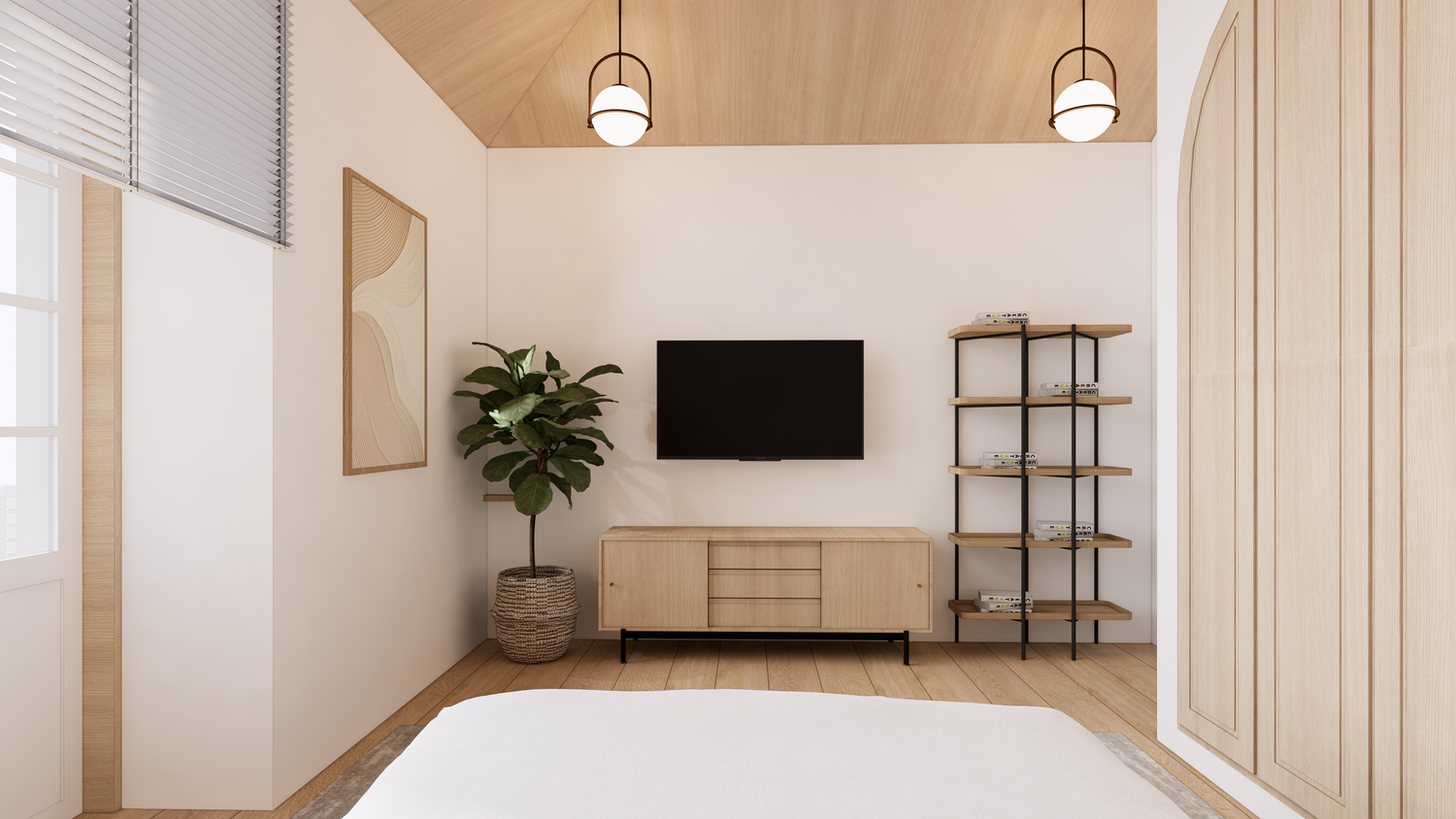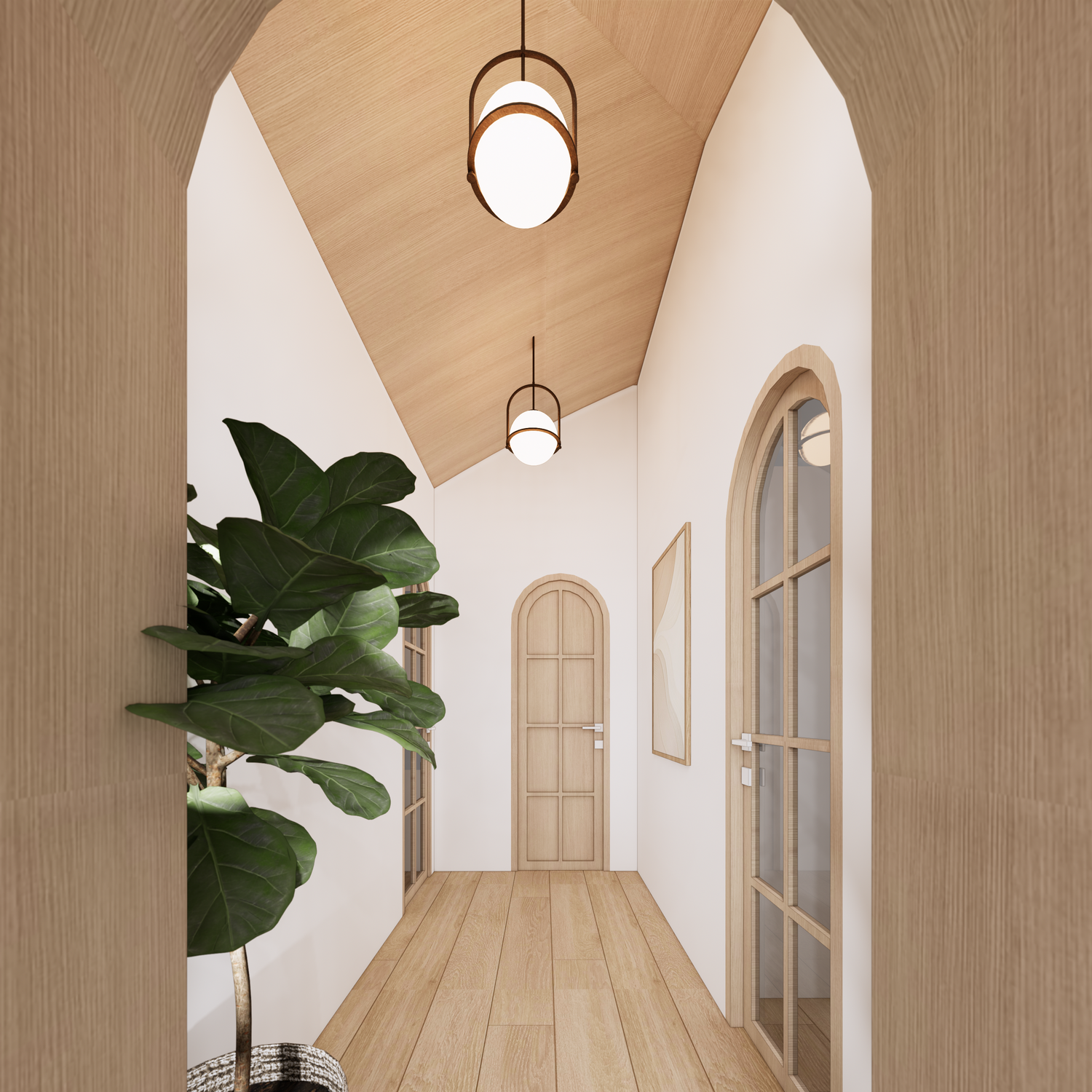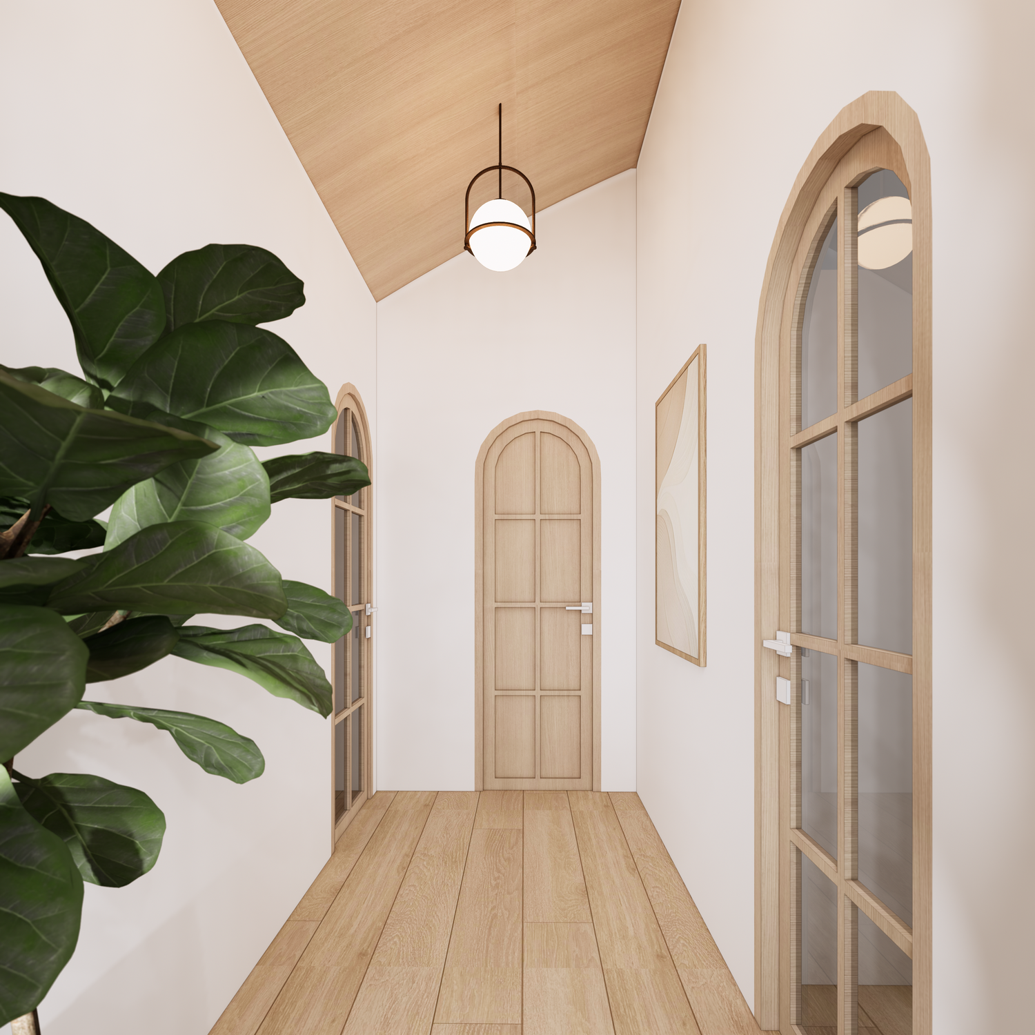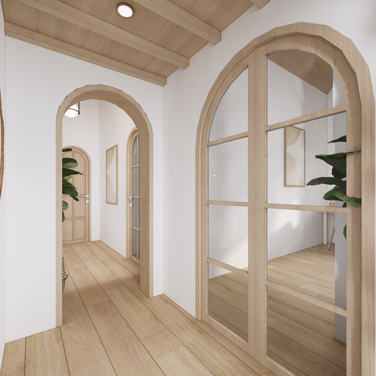 There are two bedrooms, one large and one small, each with built-in wardrobes. In the entryway, you can see many changes to the door and kitchen. I created a design dominated by white and wood tones to add a natural and clean feel.