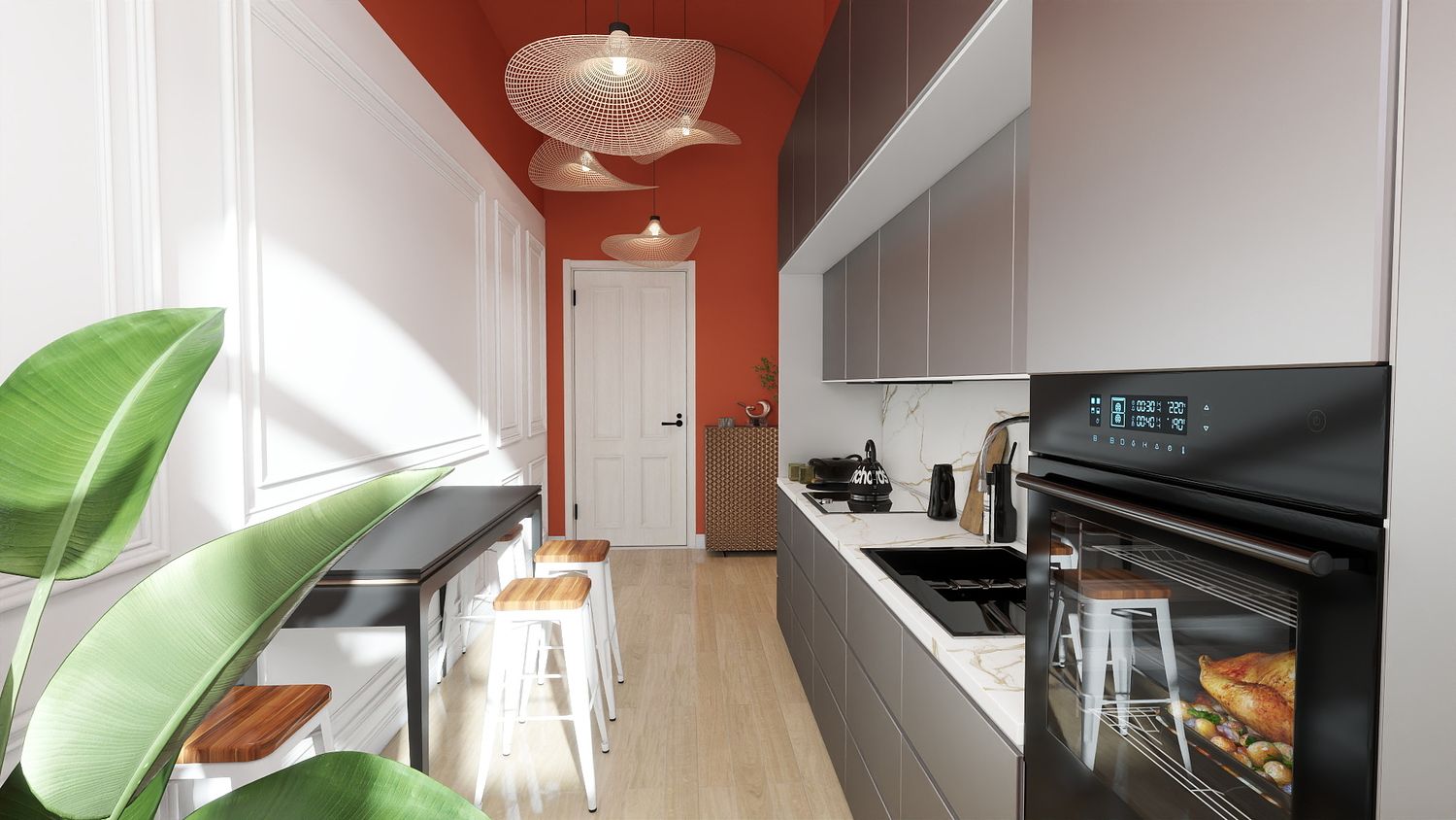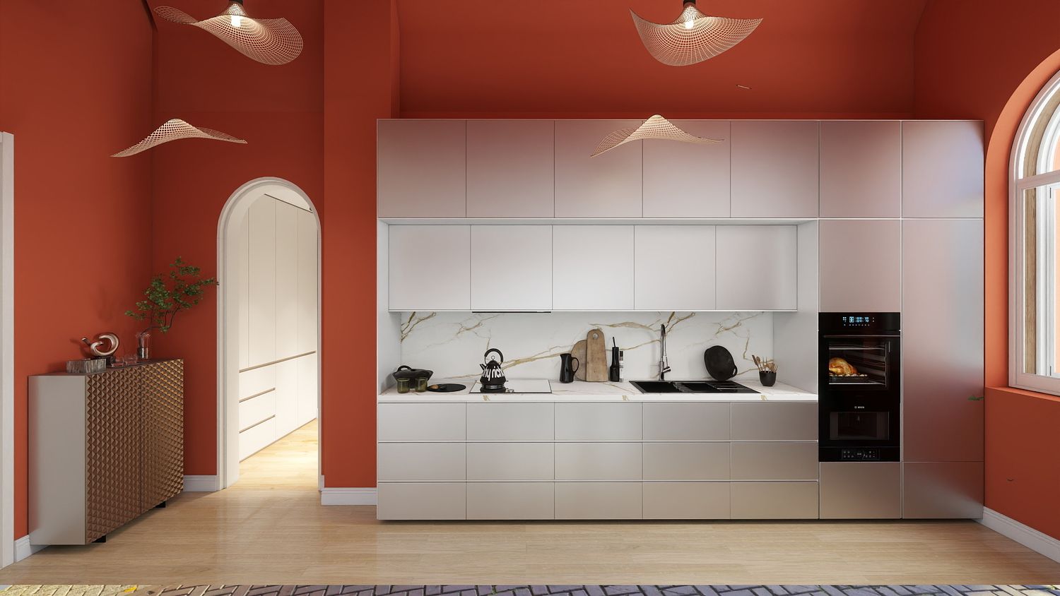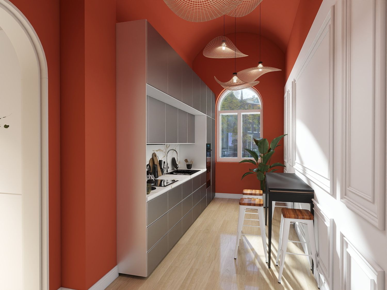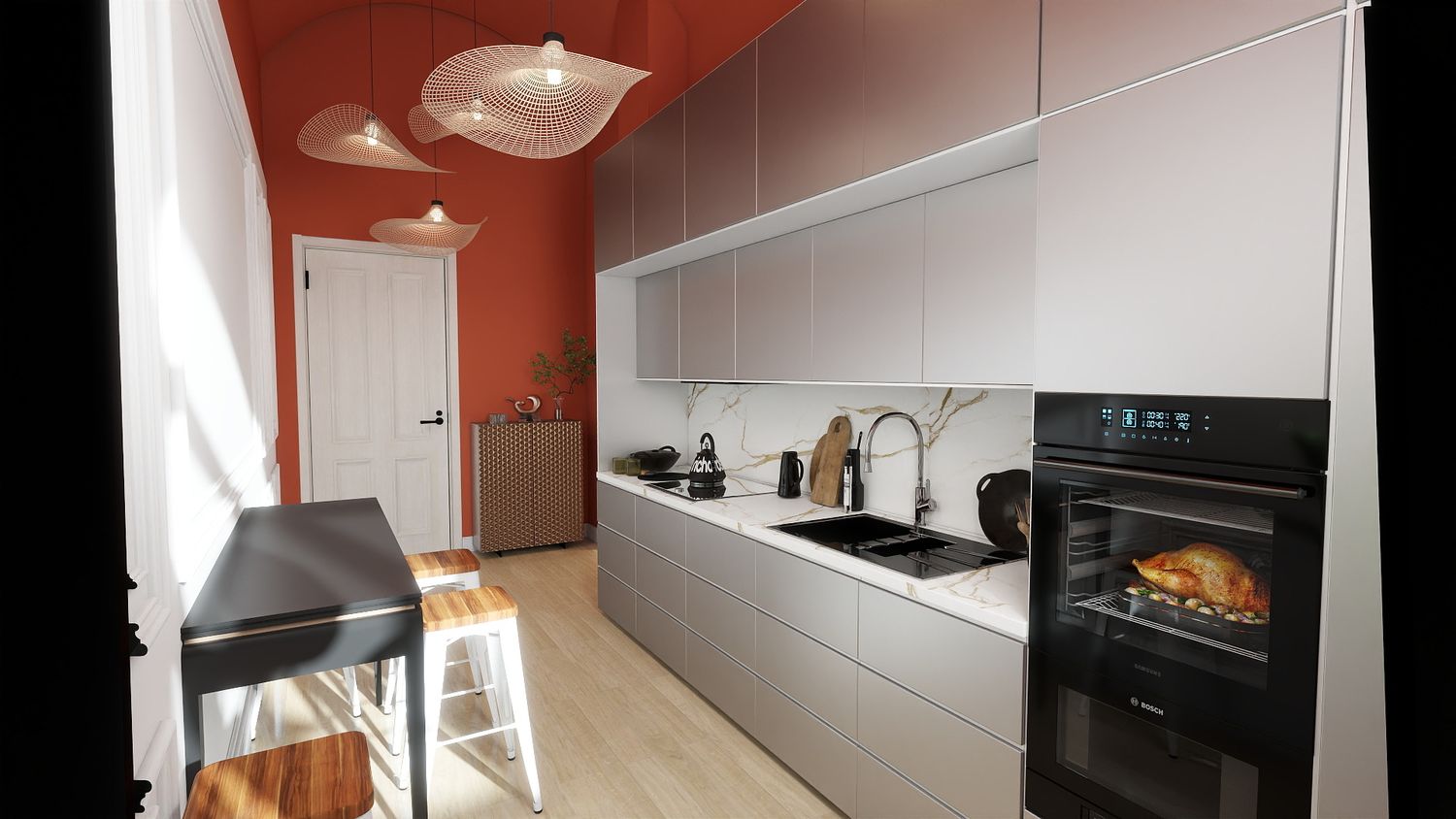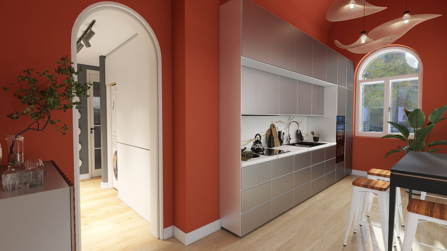 La cucina, sviluppata in linea sotto la volta a botte, è caratterizzata da toni caldi terracotta e da superfici moderne in finitura satinata. L’inserimento di un piccolo piano snack con sgabelli crea un comodo spazio per i pasti veloci, valorizzando la profondità del locale. Le lampade sospese dal design leggero accompagnano la curvatura della volta, enfatizzandone la geometria.