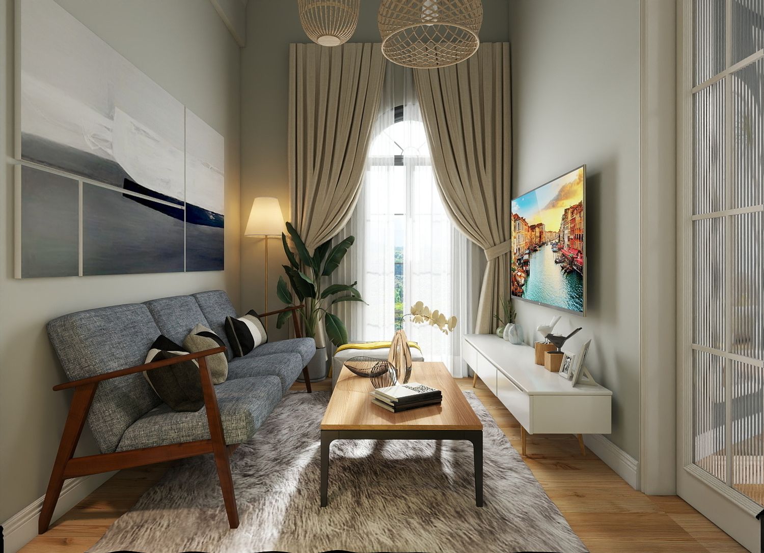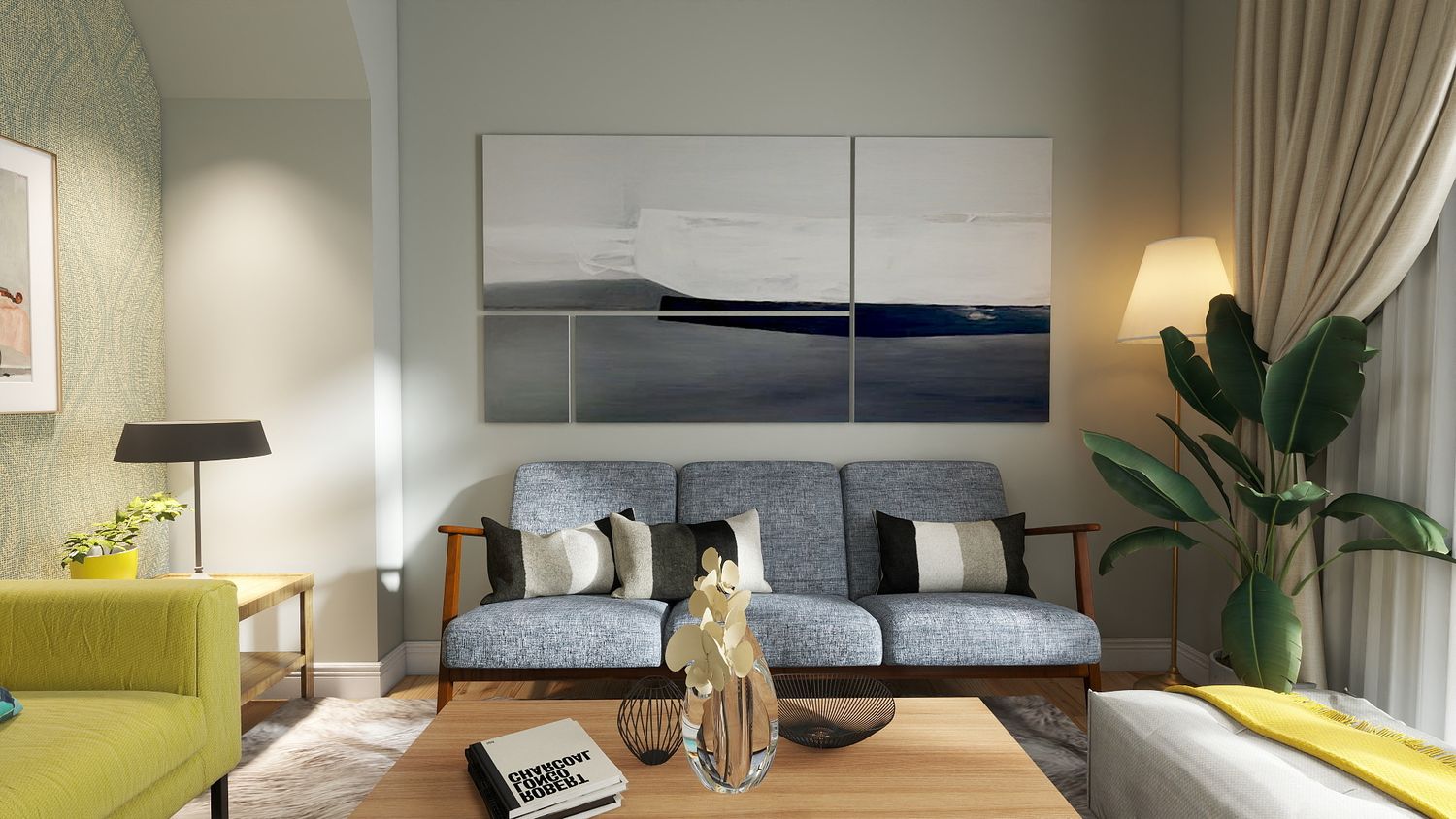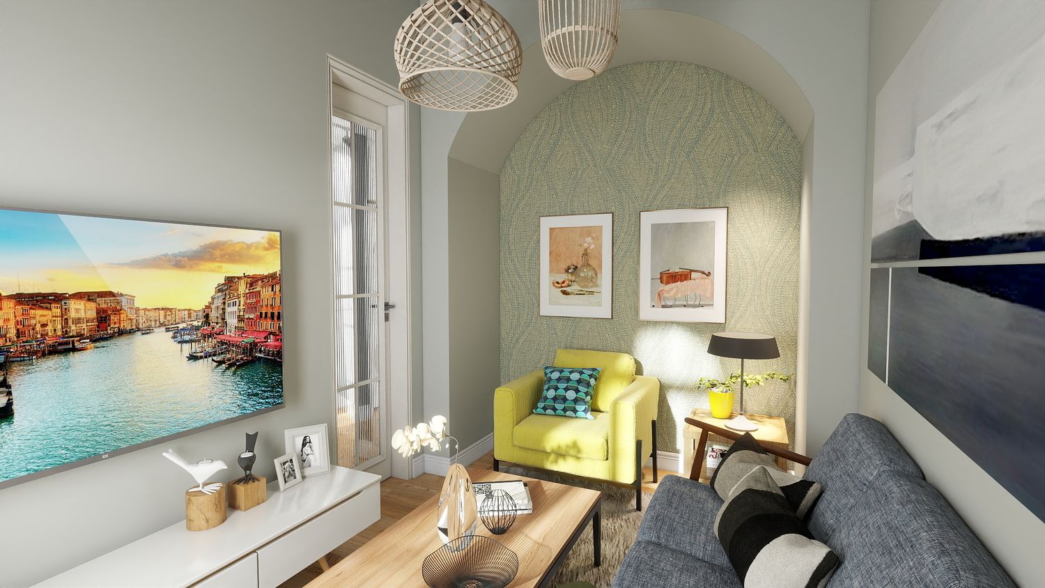 Il soggiorno, ricavato in un ambiente voltato a padiglione, accoglie un divano compatto/ o divani letto, una poltrona di accento e una parete attrezzata minimal. L’arredo, nei toni del grigio e del legno chiaro, si ispira allo stile Nordic–Modern, arricchito da texture e punti di colore che rendono lo spazio accogliente e luminoso.