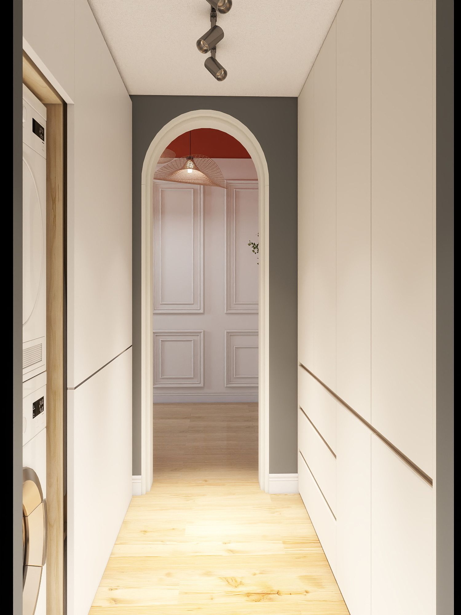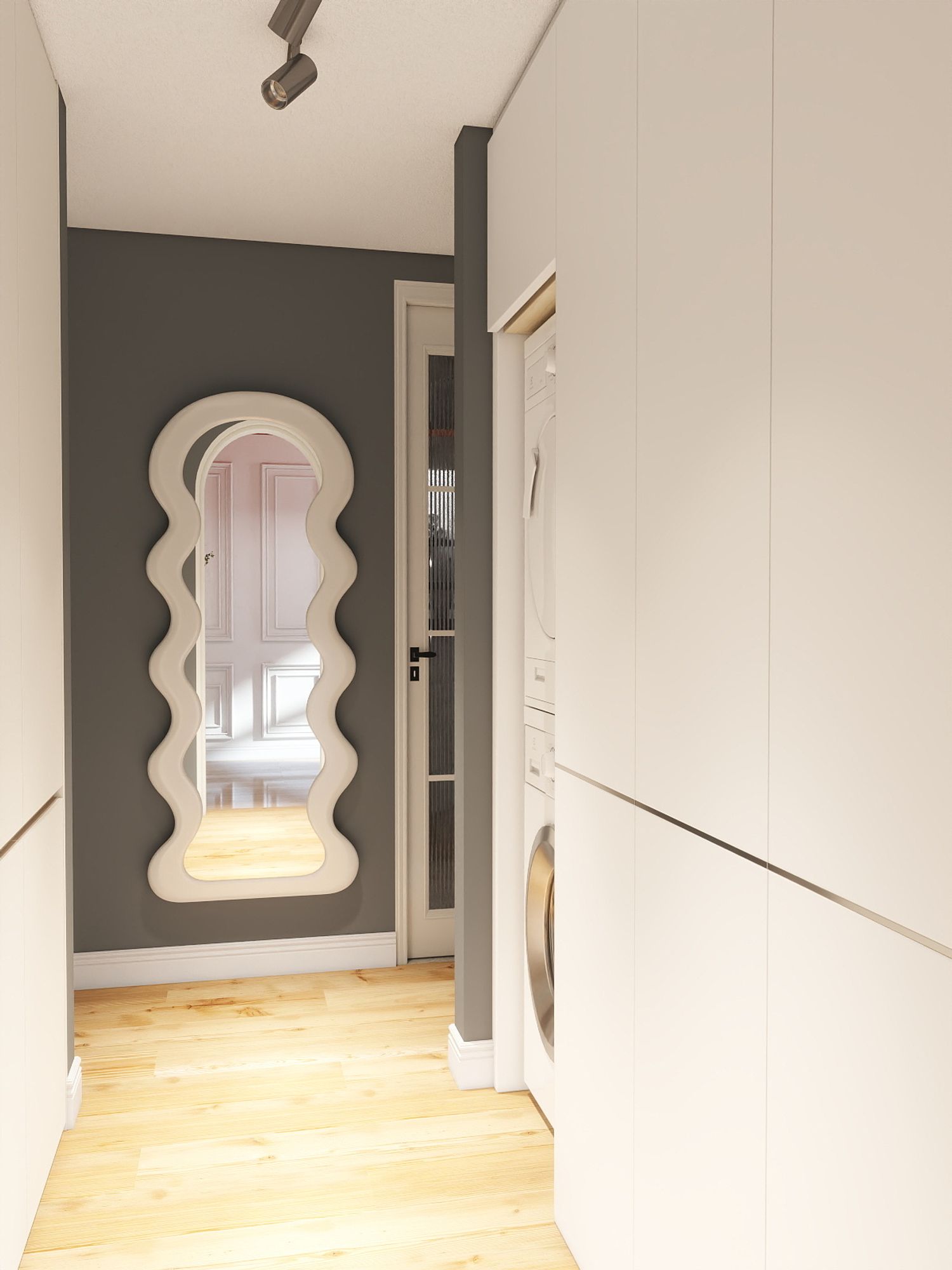 Il ripostiglio è concepito come un ambiente multifunzionale, completamente arredato con armadi a tutta altezza filo muro su entrambi i lati: da una parte moduli chiusi per riporre indumenti e accessori, dall’altra colonne integrate per lavanderia. Una grande specchiera decorativa amplifica visivamente lo spazio e riflette la luce proveniente dalla cucina, trasformando il corridoio tecnico in un elemento di design discreto ma elegante.