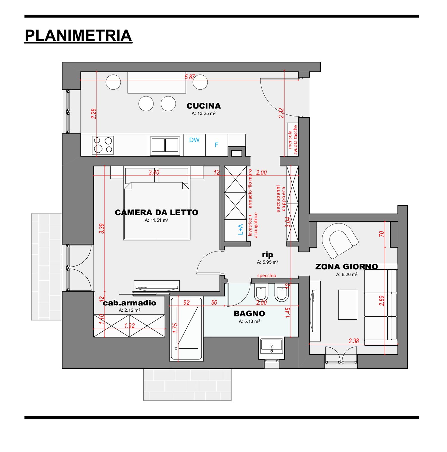 La nuova distribuzione genera un bilocale funzionale e armonico, ottimizzato per la locazione o la vendita, con arredi prevalentemente di produzione IKEA, economici e facilmente sostituibili.