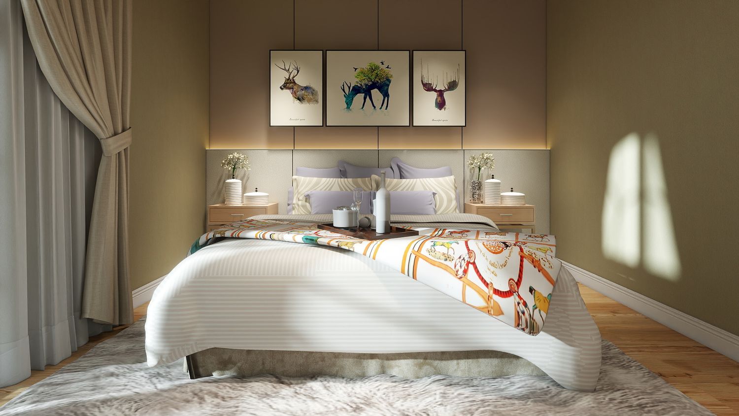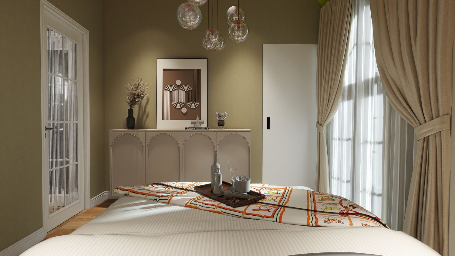 La camera principale mantiene un’atmosfera rilassante grazie alle tonalità neutre e all’illuminazione calda. Dietro al letto un pannello decorativo retroilluminato con striscia LED crea profondità e comfort visivo, mentre la cabina armadio è collocata frontalmente rispetto al letto, organizzata con moduli componibili per ottimizzare lo spazio. Gli arredi, essenziali ma eleganti, bilanciano comfort e funzionalità.