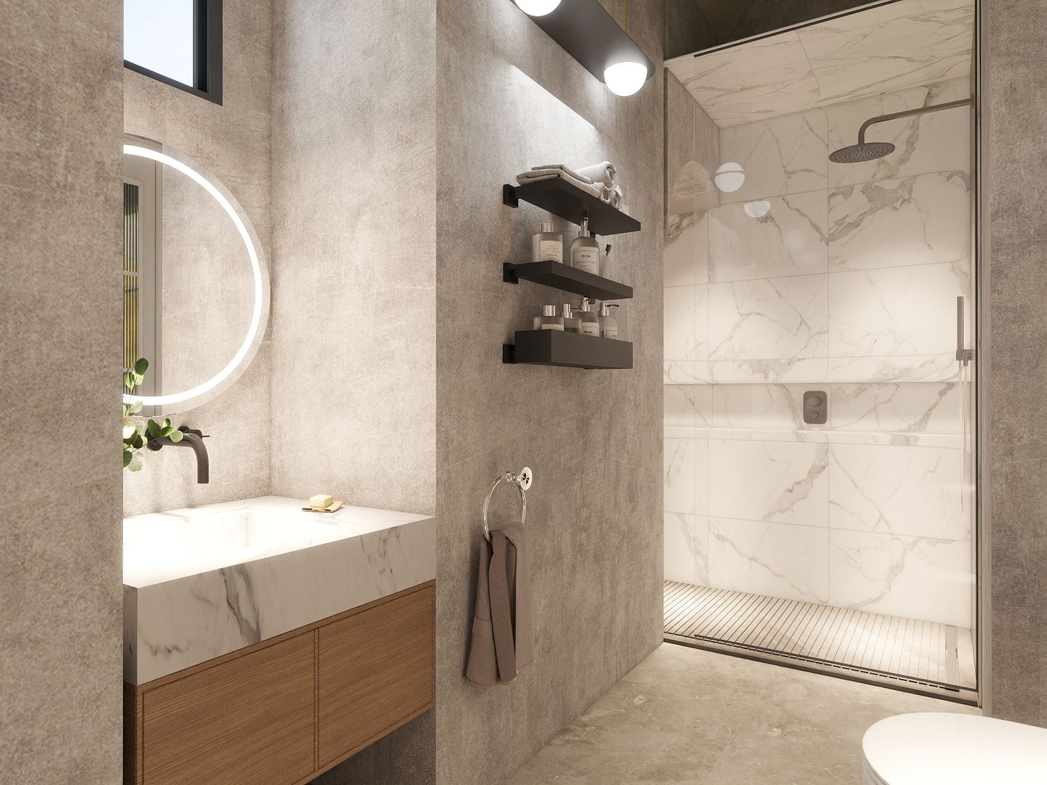 Il bagno, completamente rinnovato, presenta finiture in gres effetto pietra e inserti in marmo bianco. La doccia walk-in, ampia e contemporanea, si combina a un mobile lavabo sospeso in legno naturale e a un grande specchio retroilluminato, contribuendo a una percezione di maggiore spaziosità e luminosità.