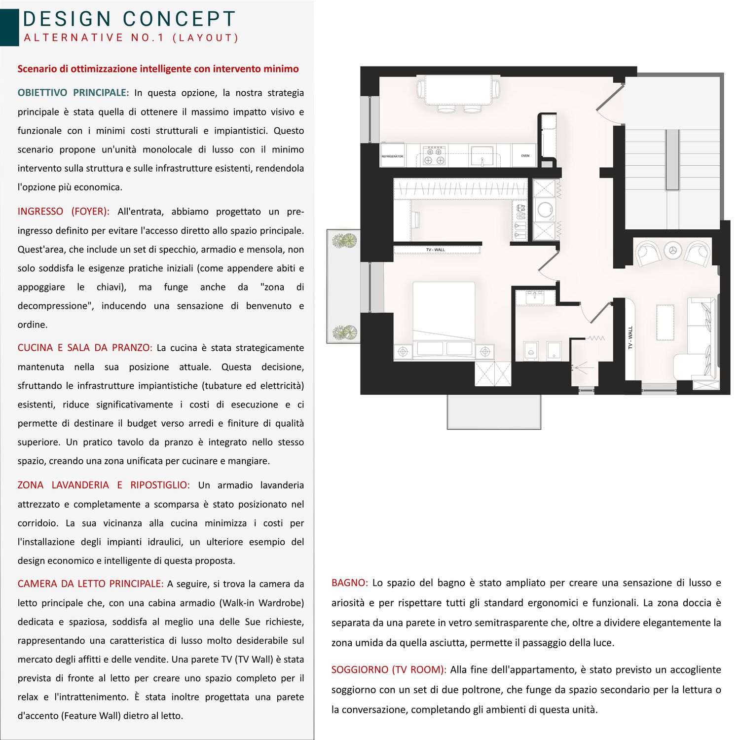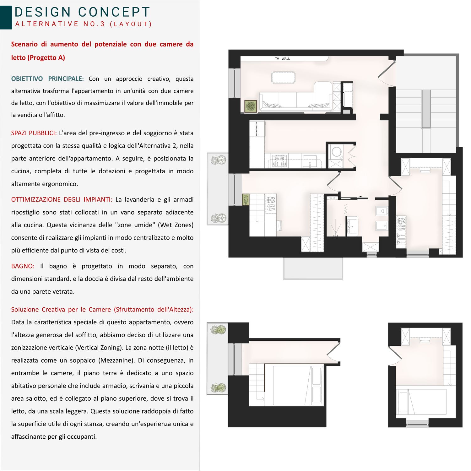 Di seguito, presenteremo in dettaglio ciascuno degli scenari proposti. Le descrizioni tecniche complete e le immagini di ogni progetto sono disponibili nelle relative tavole dedicate. Inoltre, abbiamo preparato per Lei una spiegazione degli elementi chiave del design e della filosofia alla base delle nostre scelte.