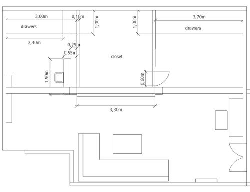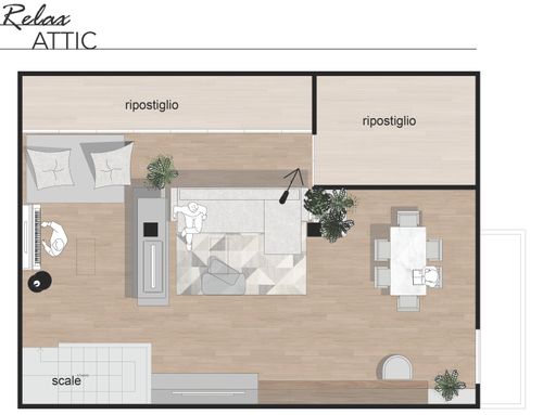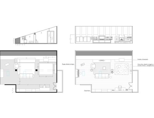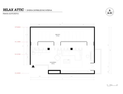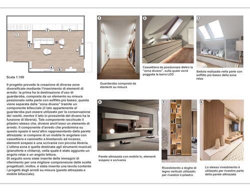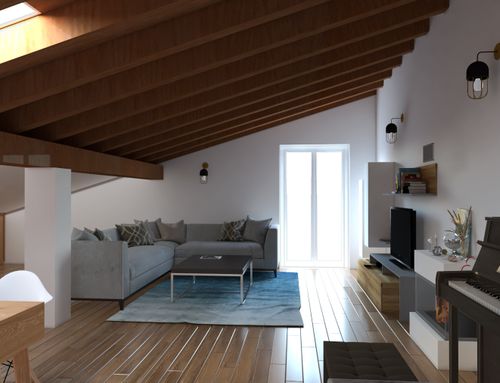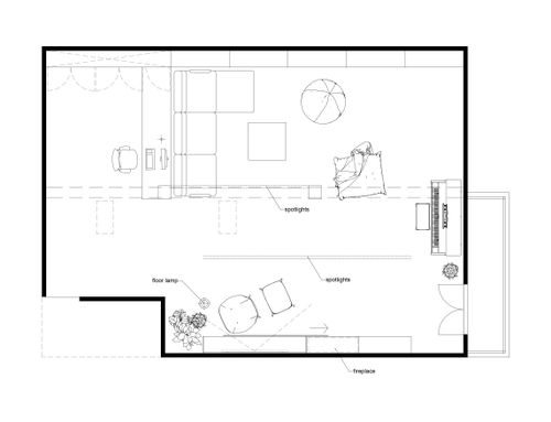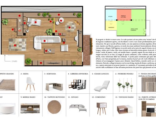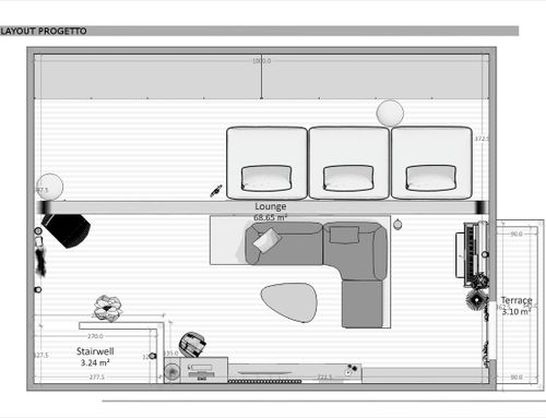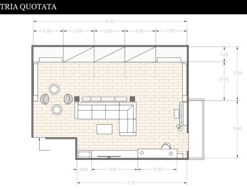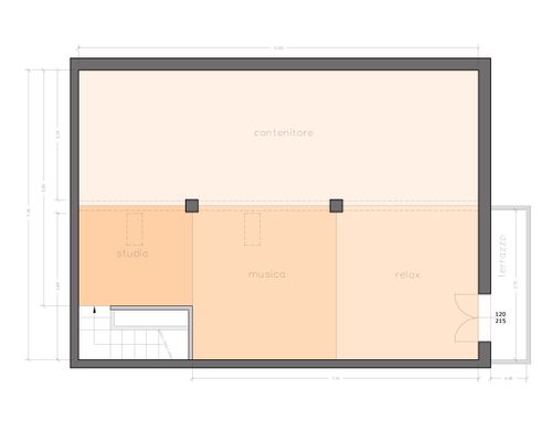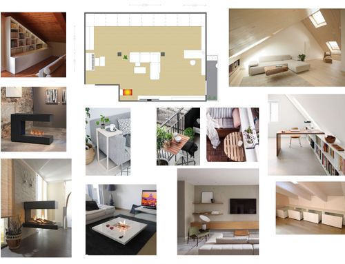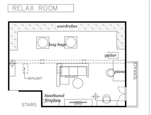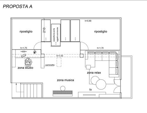 Questo spazio diventerà un soggiorno con studio in stile moderno. Ci piacerebbe un divano ad "L" o con penisola, un mobile per la TV, una libreria e un tavolo da studio con pc. Inoltre possediamo un pianoforte nero a muro e una chitarra che vorremmo posizionare in questa stanza. Vorremmo capire come sfruttare al meglio la parte più bassa (armadiature?) e come creare dei punti luce oltre ai due lucernari, la porta della terrazza e i 4 punti a muro già presenti (vedere foto). Ci piacerebbe anche aggiungere un piccolo caminetto a bioetanolo per dare calore all'ambiente.