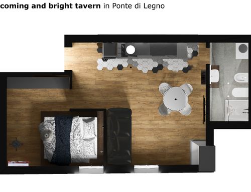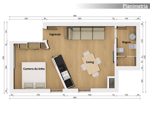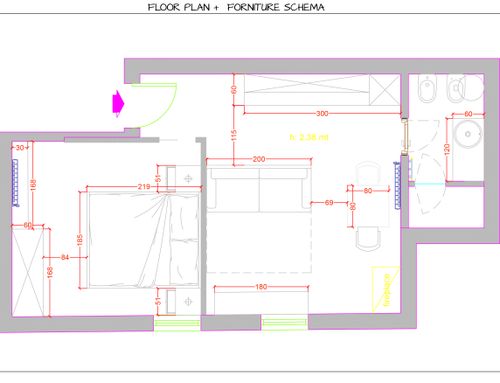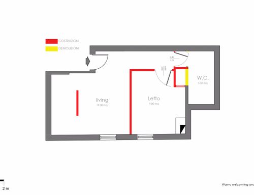Vorrei in questi pochi mq avere una camera da letto piccolina matrimoniale e privilegiare la parte living e cucina.