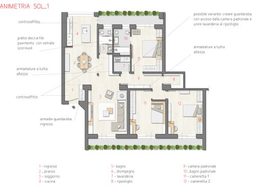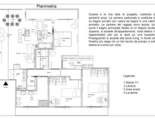 Da realizzare :camera padronale con bagno accesso diretto, due camere ragazzi, due bagni tutti e due con bidet, lavanderia con solo spazio lavatrice, ripostiglio, ingresso con spazio per mobile scarpe e appendi abito, cucina living con isola.