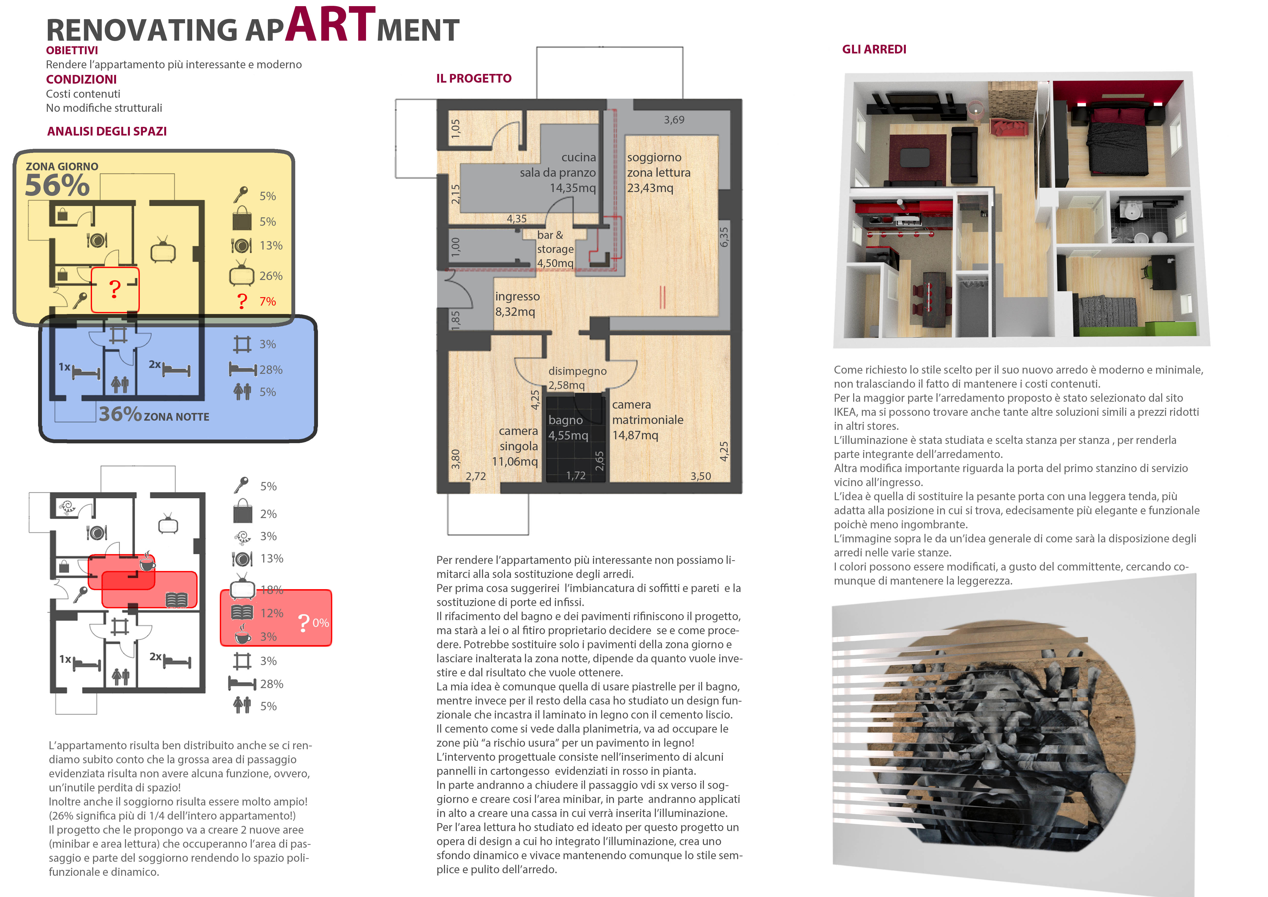 Mi piacerebbe ricevere delle belle immagini di come potrebbe venire l'appartamento, da mostrare eventualmente a compratori che dovessero concretizzarsi prima dell'inizio dei lavori, e una lista dettagliata degli interventi consigliati con relativi costi.