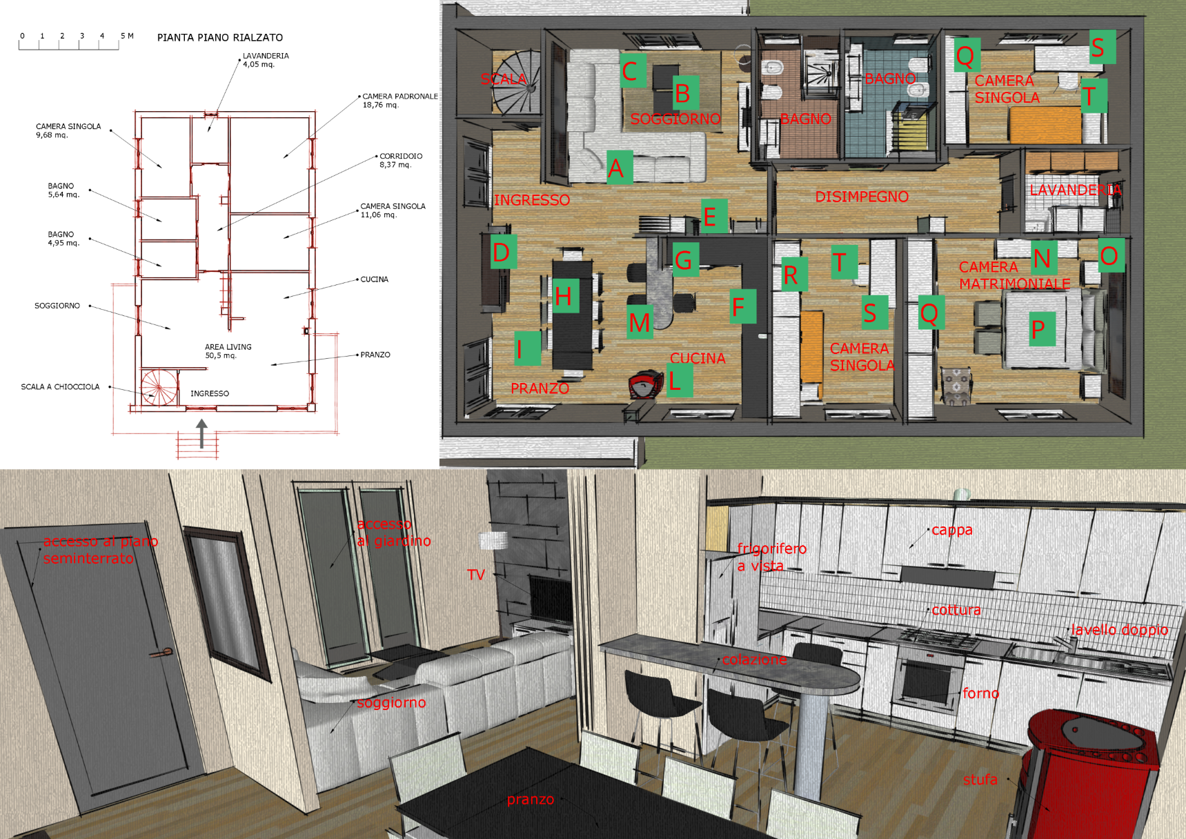 Abbiamo bisogno di ristrutturare una casa monofamiliare composta da piano interrato con garage singolo, bagno e taverna dove da una piccola scala a chiocciola si accede al piano principale. Il piano da ristrutturare è leggermente rialzato rispetto la quota della strada. La casa è stata costruita nel 1972 e non sono previsti sistemi di isolamento. La casa ha le paresti esterne portanti e due colonne al centro della pianta. Tutti gli impianti sono da rivedere, infissi sono da cambiare e manteniamo le tapparelle.