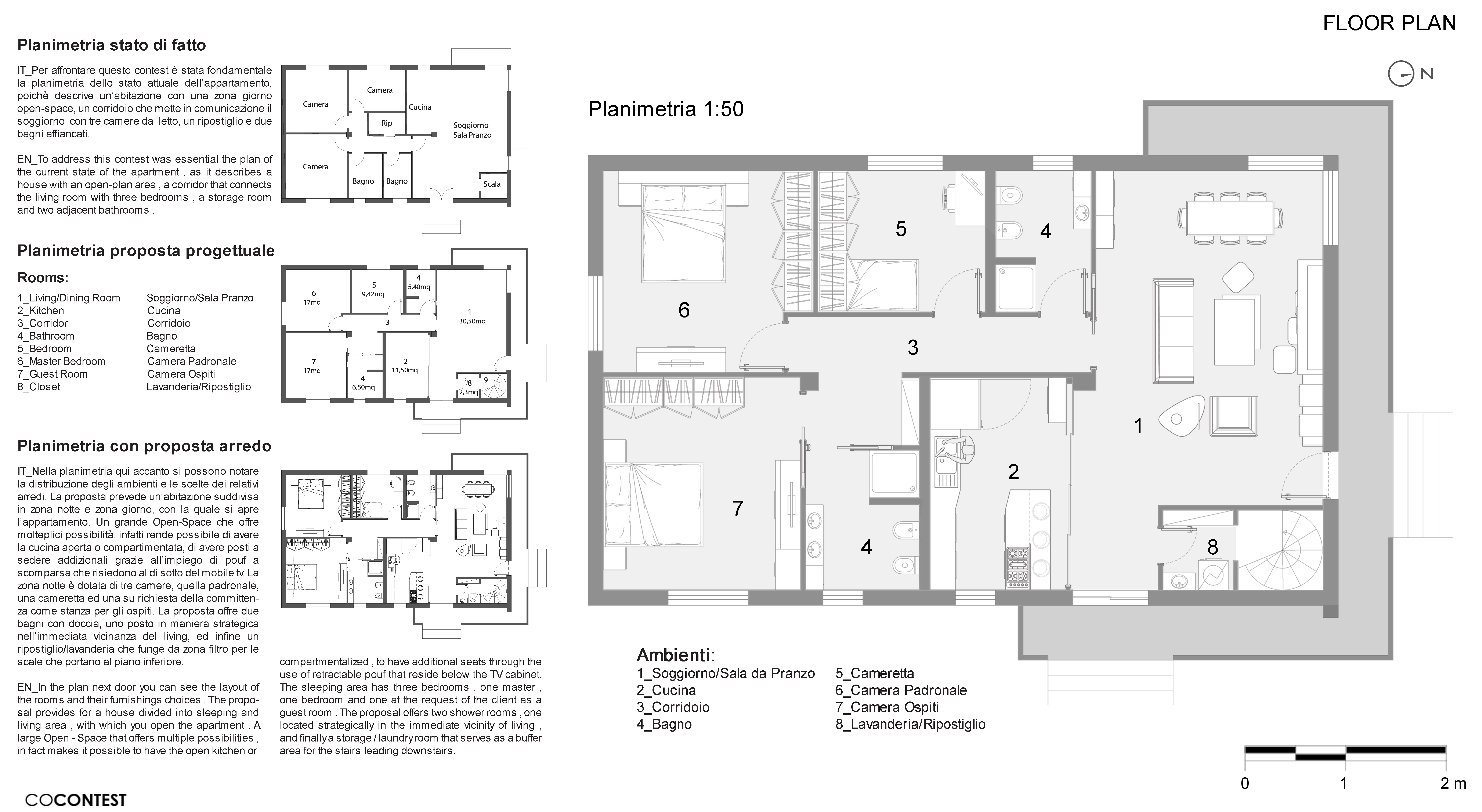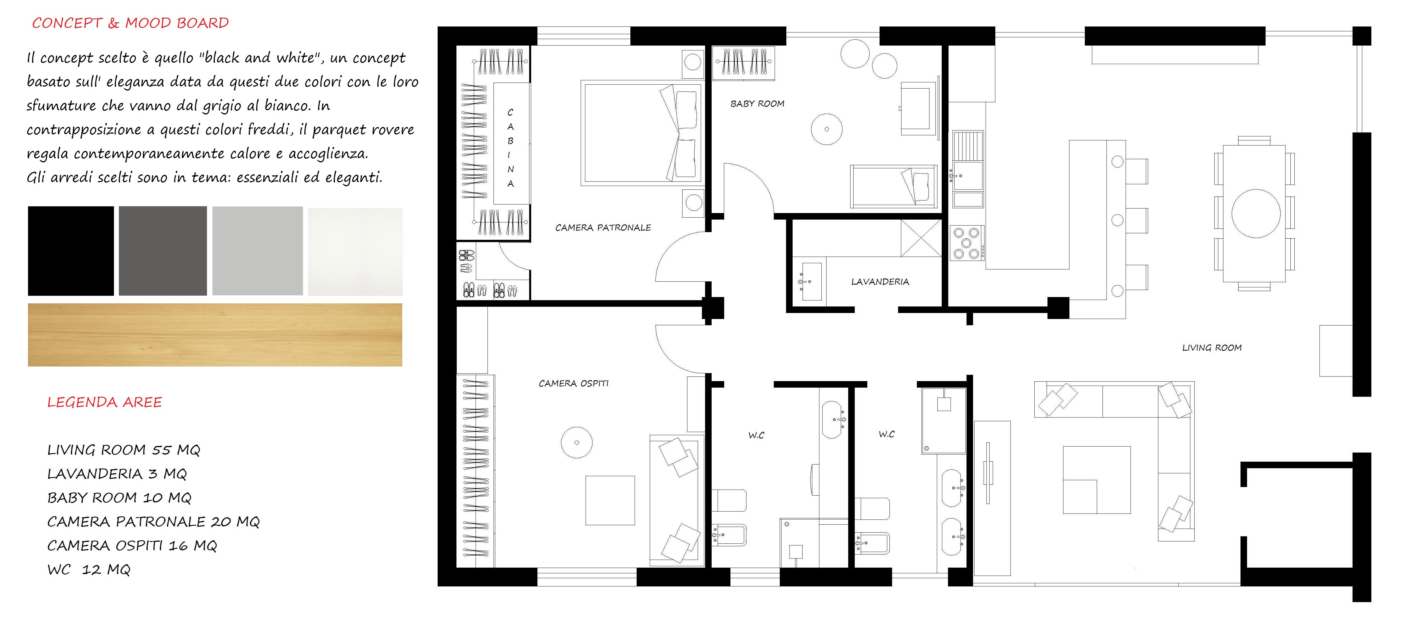 Vorremmo mantenere tre camere, due bagni, possibilmente un ripostiglio, zona giorno ampia ma con delle soluzioni per evitare che gli odori della cucina contaminino il salotto e zona notte. Come colore predominanti ci piace il bianco nell’arredamento e per i pavimenti ci piacerebbe considerare il legno o una mattonella grande.