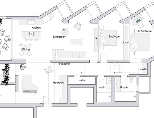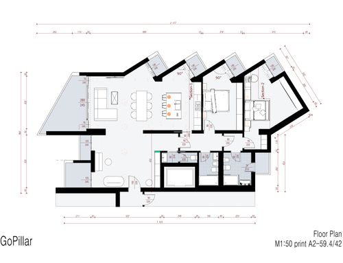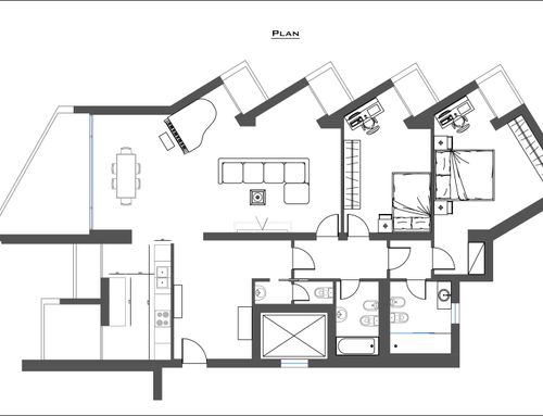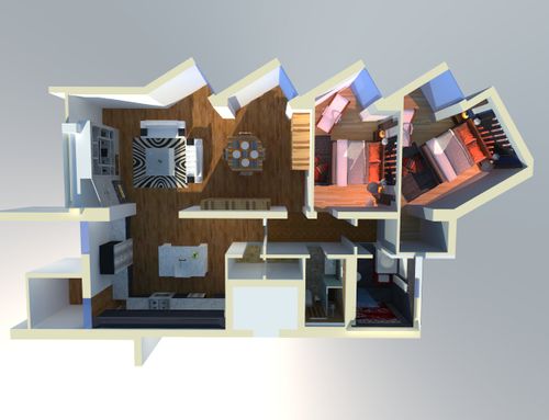 -a big open space/living room(rooms with red label 1,2,3,4) that will have some walls in the middle in it as you can see from the planimetry. This room would have the kitchen as well.