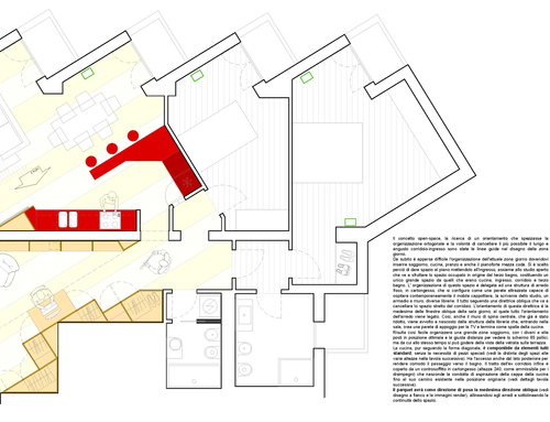 -un grande open space (stanze con la scritta in rosso 1,2,3,4) separato parzialmente da dei muri, in questo open space è prevista una cucina a vista: non ci sono particolari vincoli sulla disposizione
